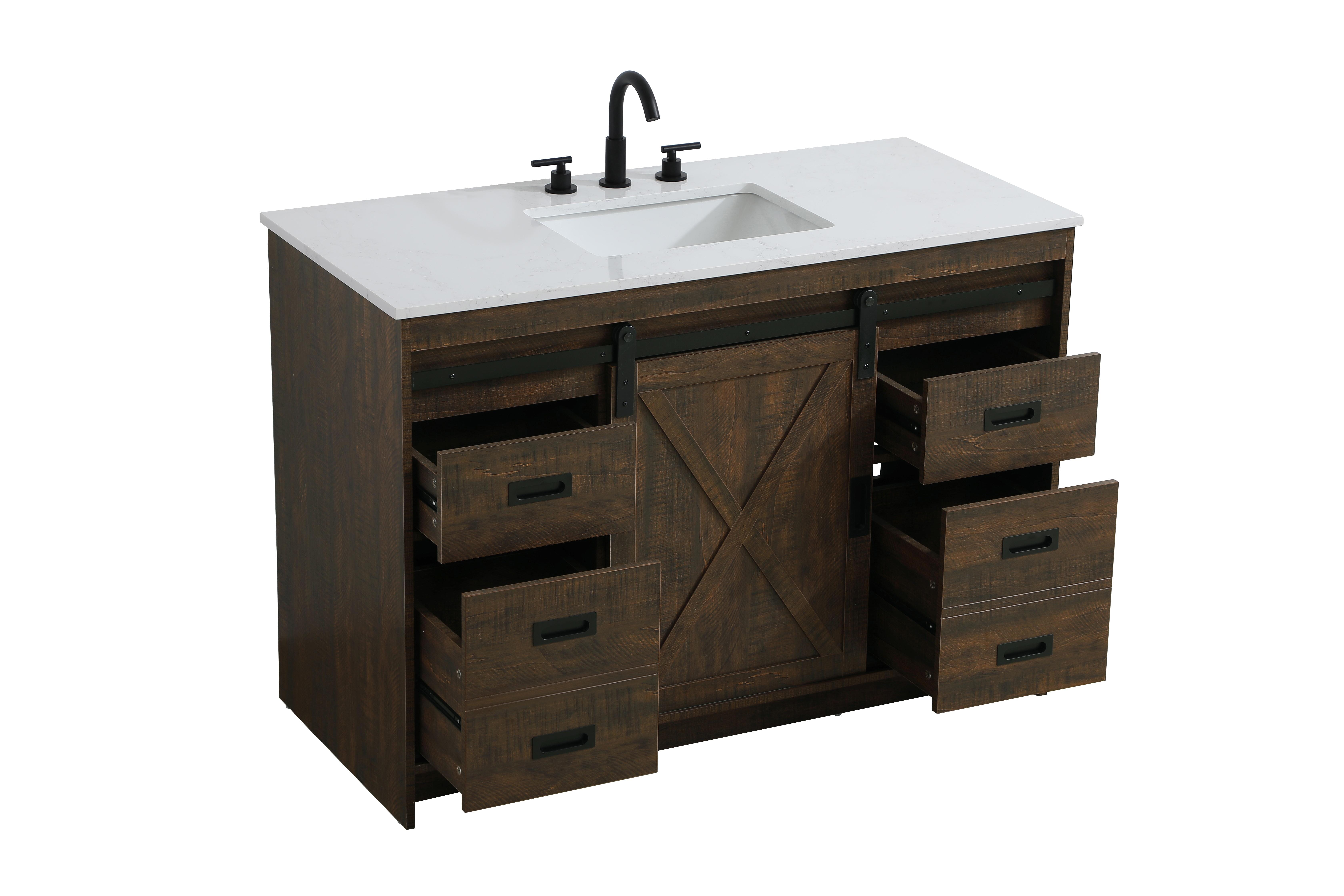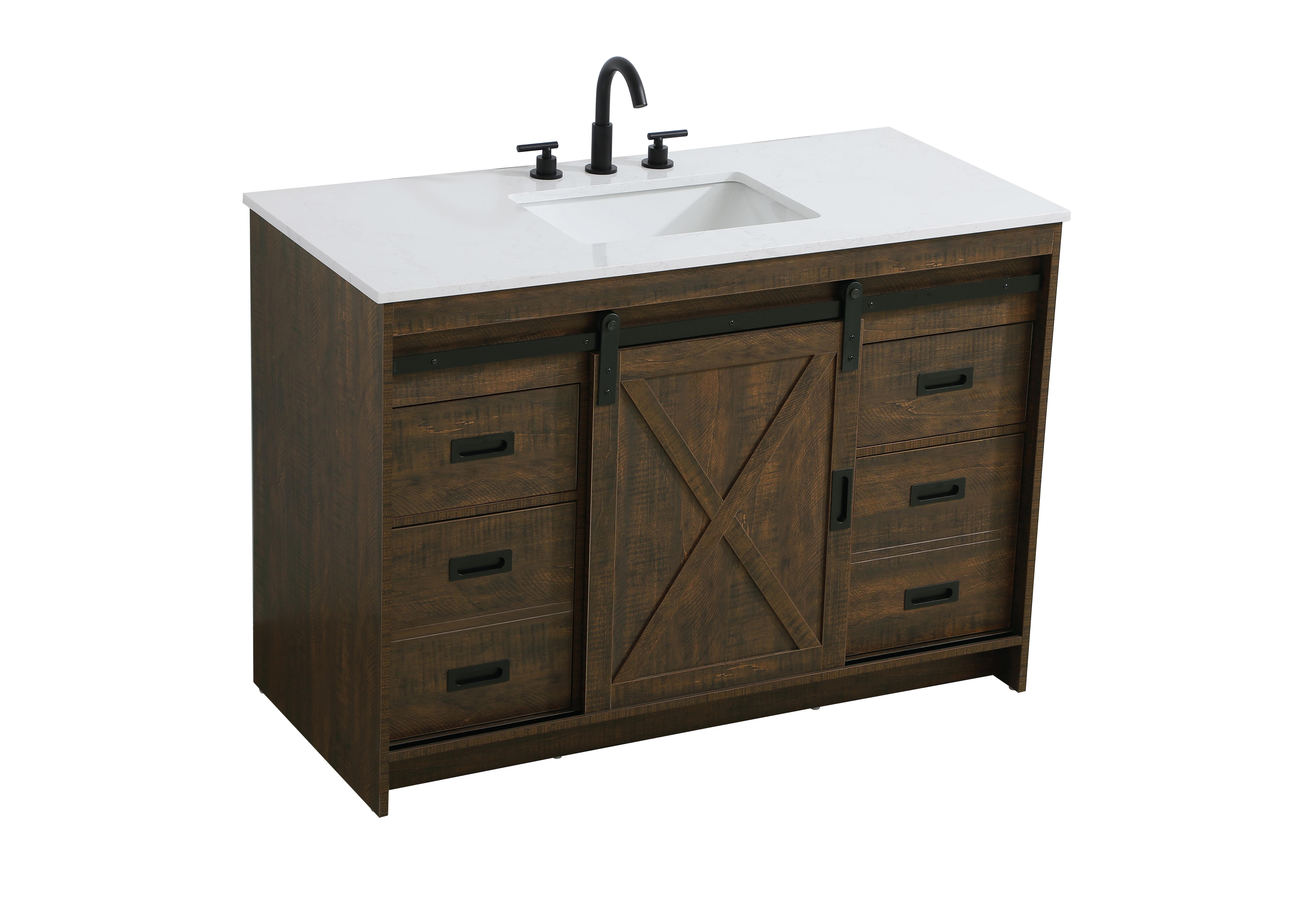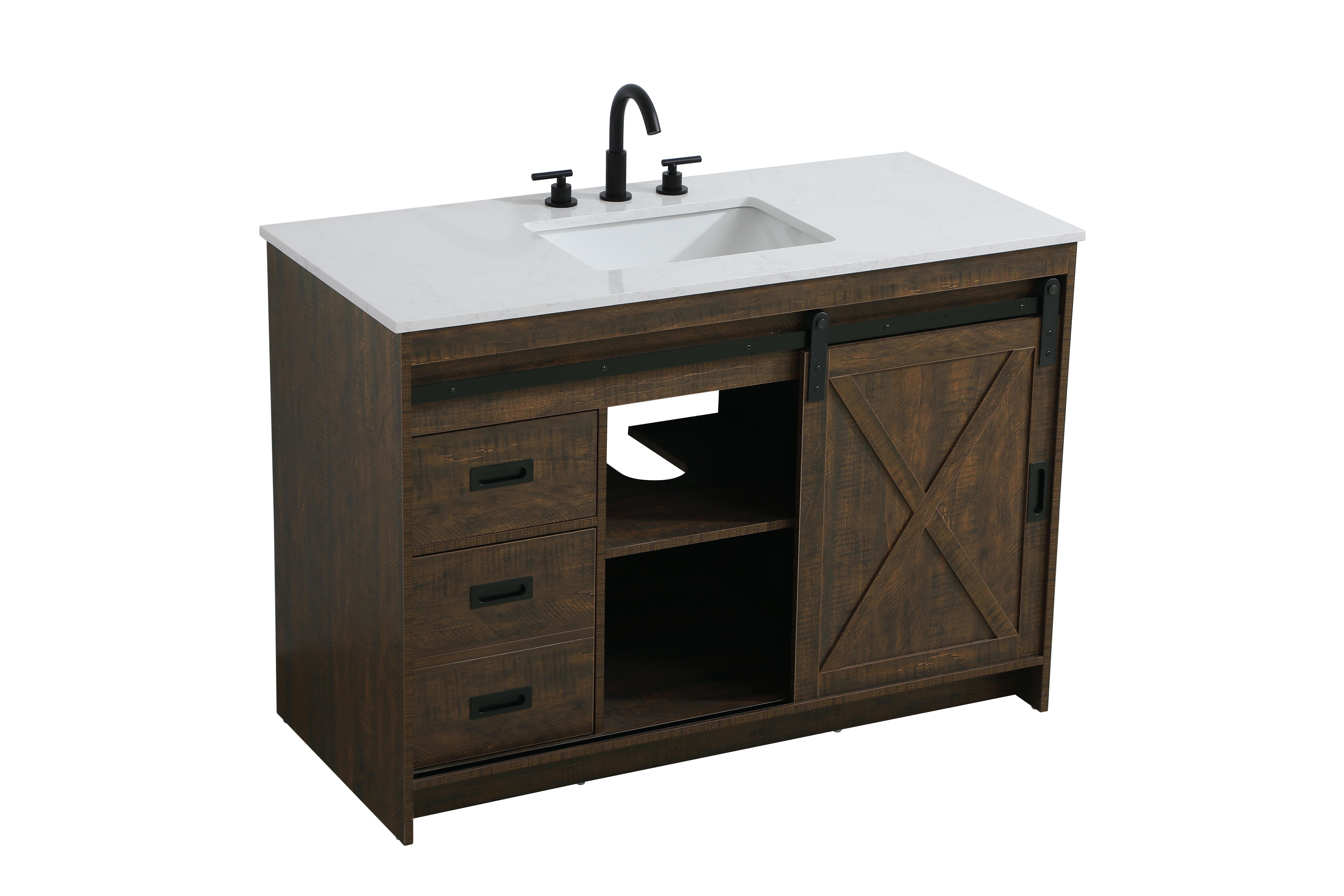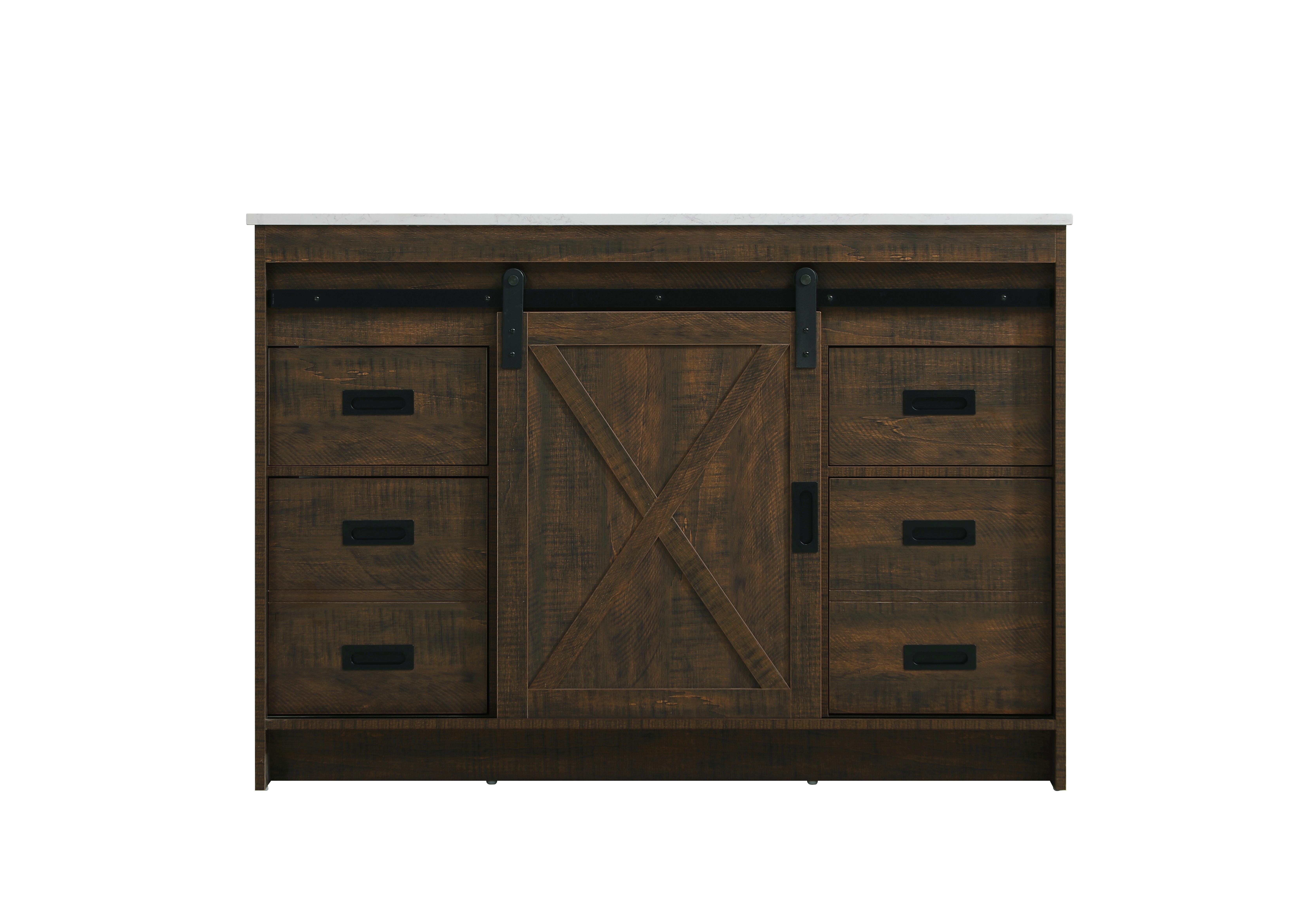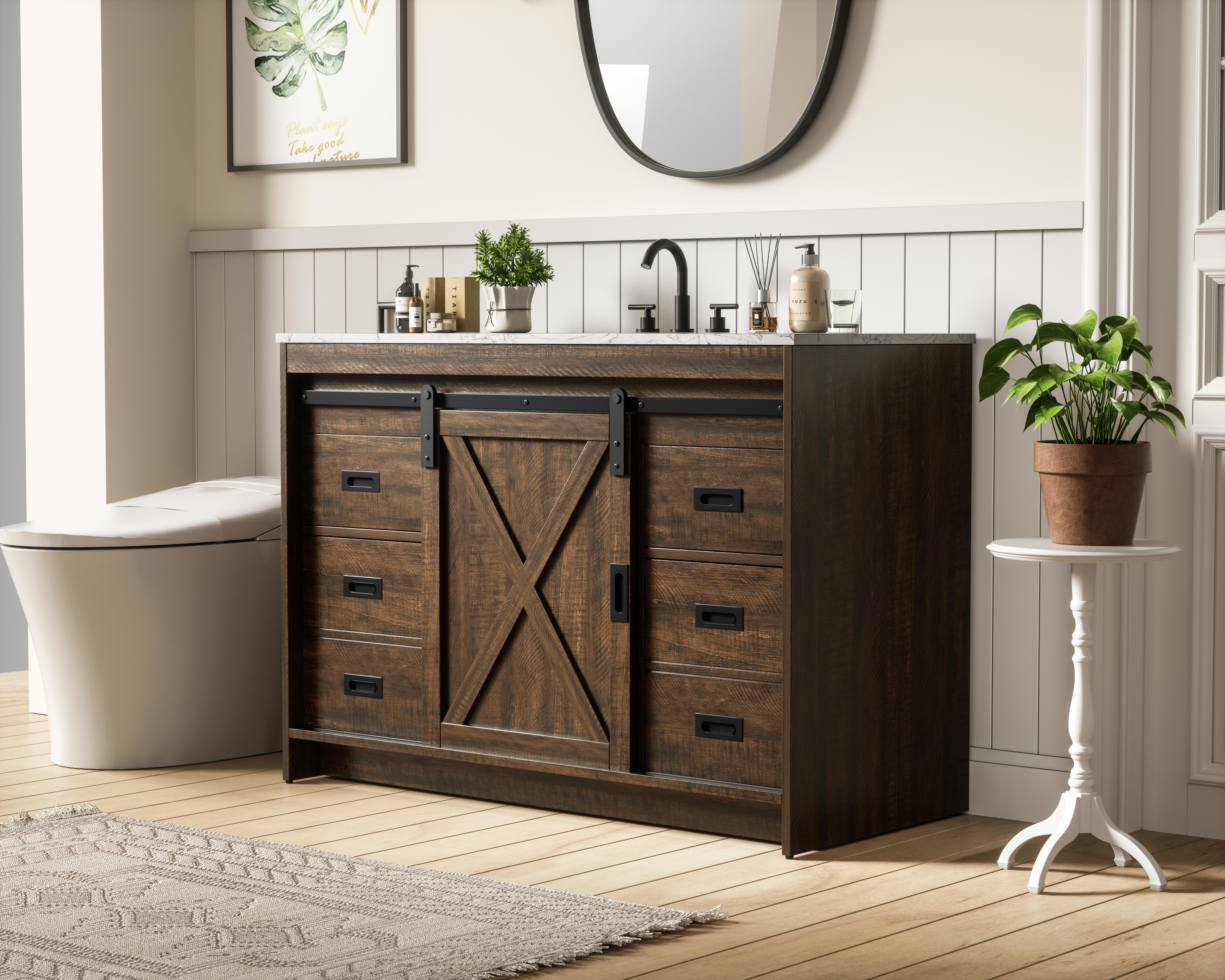 Transform your bathroom with this rustic barnyard-style vanity, designed to balance aesthetic appeal and functionality. Featuring a sliding barn door with black metal hardware and complementary handle pulls, this piece blends rugged charm with practical design. The engineered marble countertop displays unique marbling, while the porcelain undermount sink offers easy maintenance and durability. Available in Espresso, Natural Oak, and Rustic Grey finishes, this vanity suits a range of styles. It includes a deep storage drawer for larger items, a hidden shelf for towels or decor, and adjustable foot levelers for added stability on uneven floors. With pre-drilled faucet holes for easy setup, this vanity delivers style and substance to enhance your bathroom.