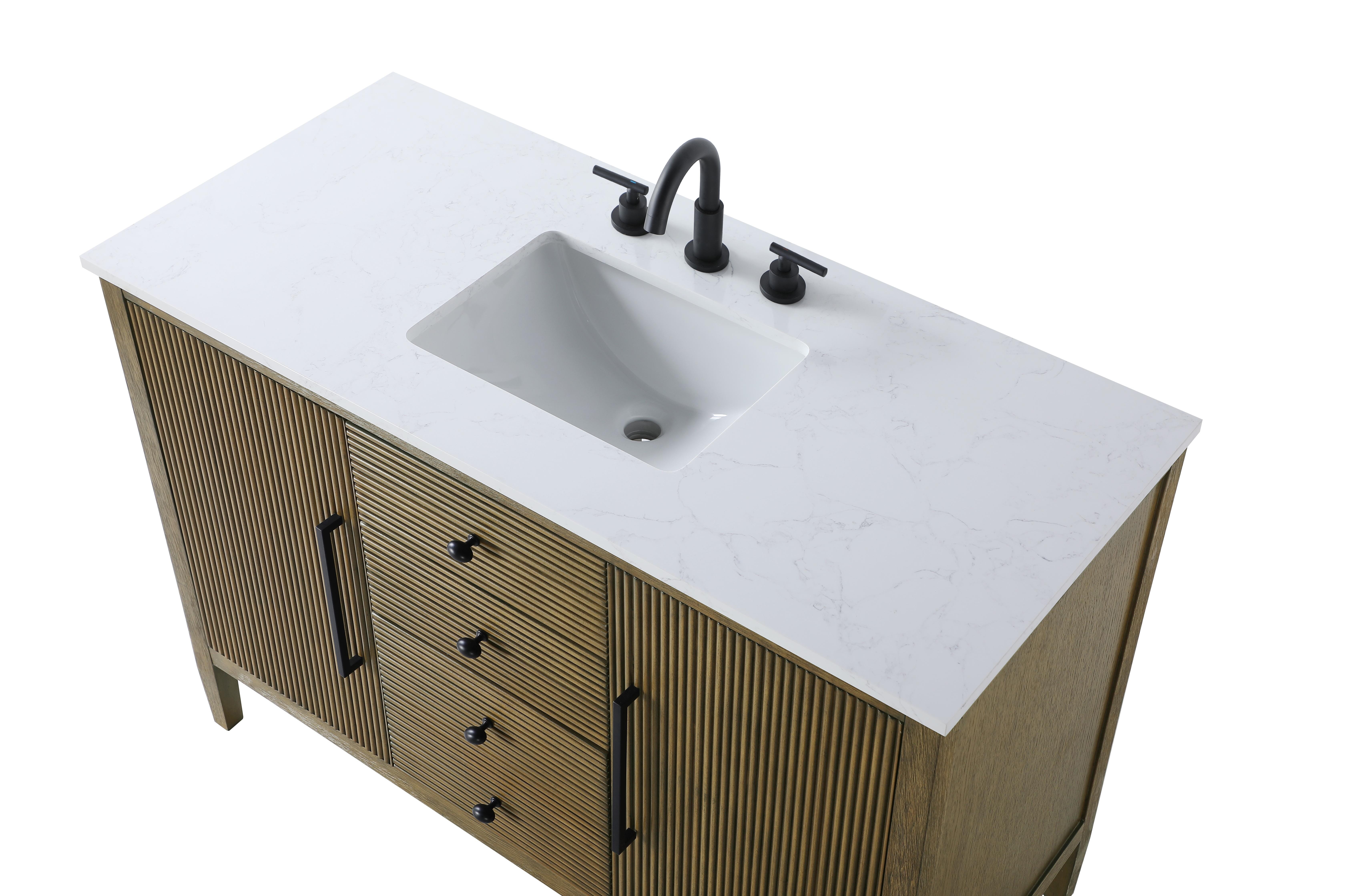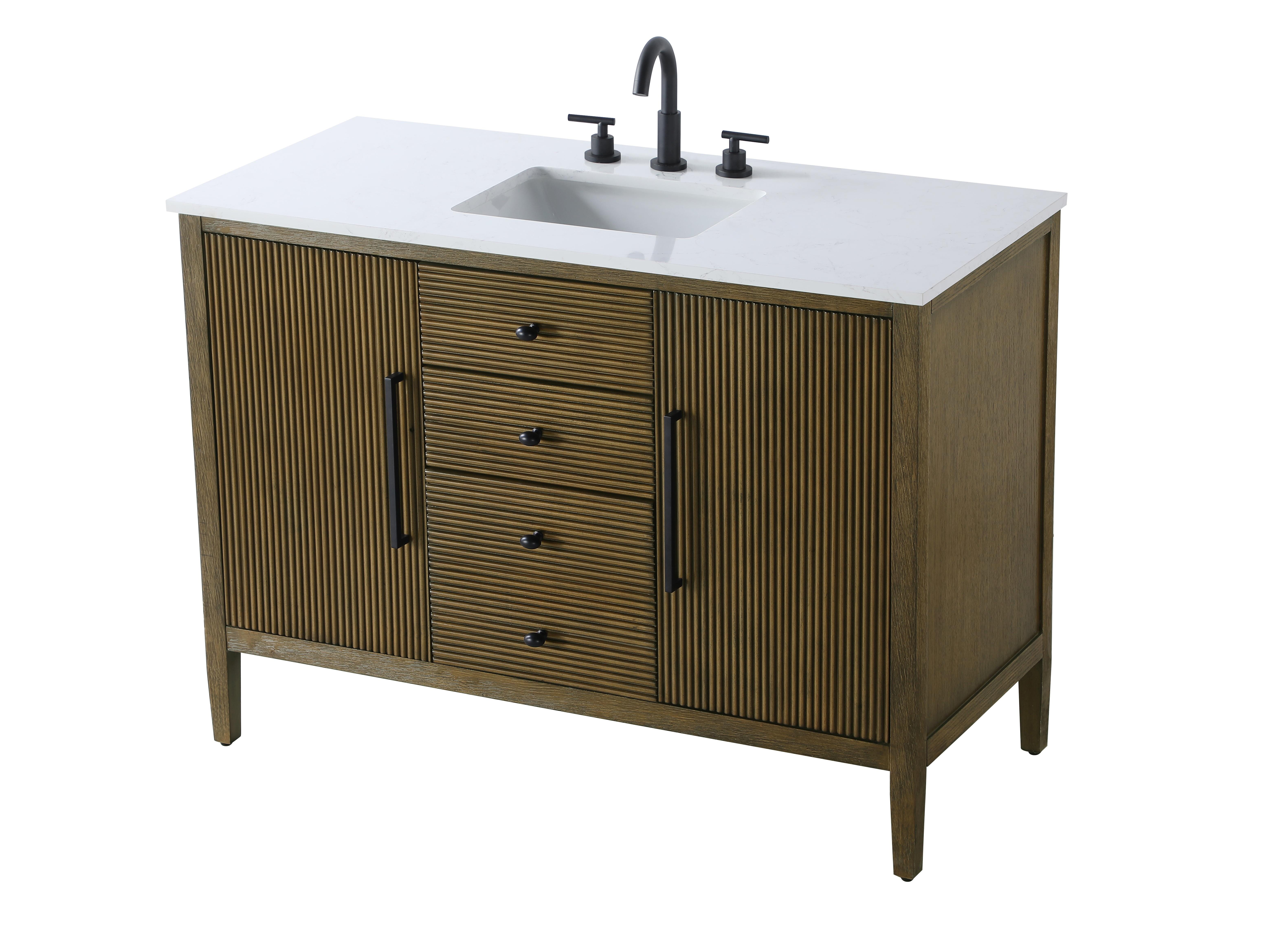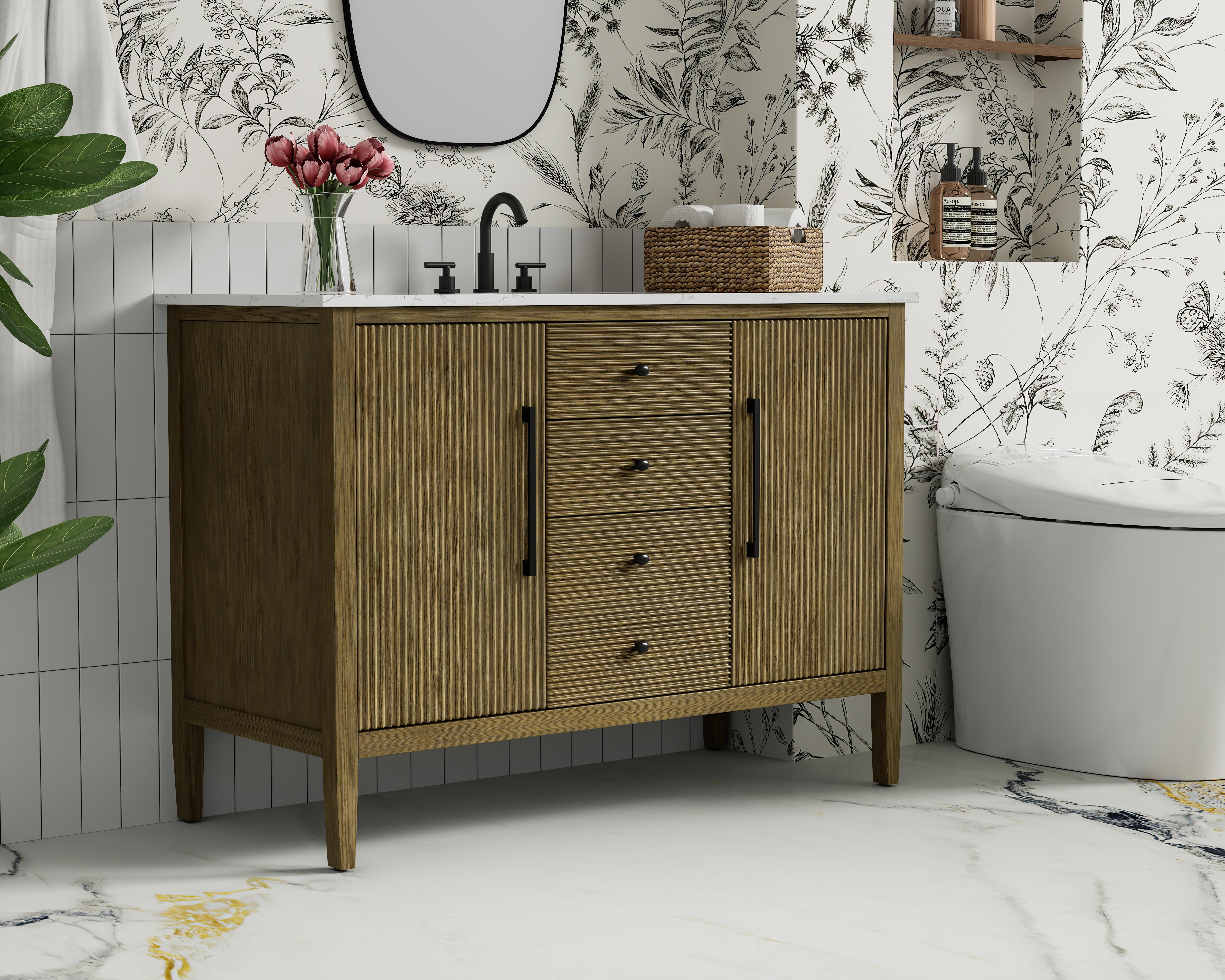 Designed with transitional elegance in mind, this Modern Fitting bathroom vanity seamlessly blends traditional elements with modern functionality. Available in five stunning finishes, from the clean sophistication of Crisp White to the natural warmth of Honey Oak, the fluted door and drawer panels add subtle texture and charm. The white marble countertop with natural veining exudes luxury, while the soft-closing doors with sleek black metal pulls offer a quiet, refined experience. Practicality is never compromised, with features like the U-shaped shelf for plumbing, and pre-drilled faucet holes for easy customization. Whether your style leans modern or classic, this vanity is the perfect balance of beauty and function, appealing to customers with a taste for quality and style.