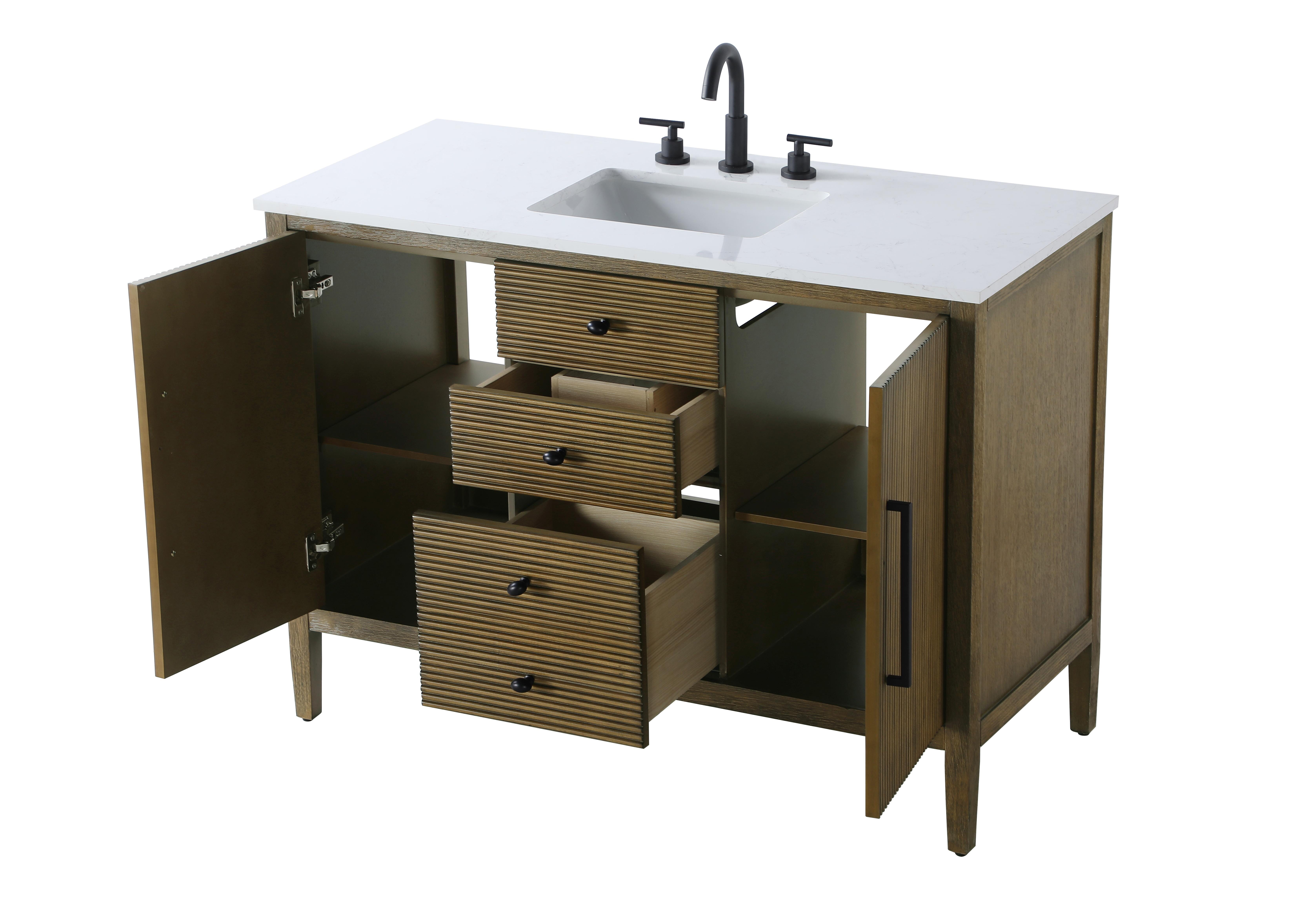Inside the cabinet, the shelf is thoughtfully designed with a U-shaped cutout to allow for seamless plumbing installation while maintaining storage space.