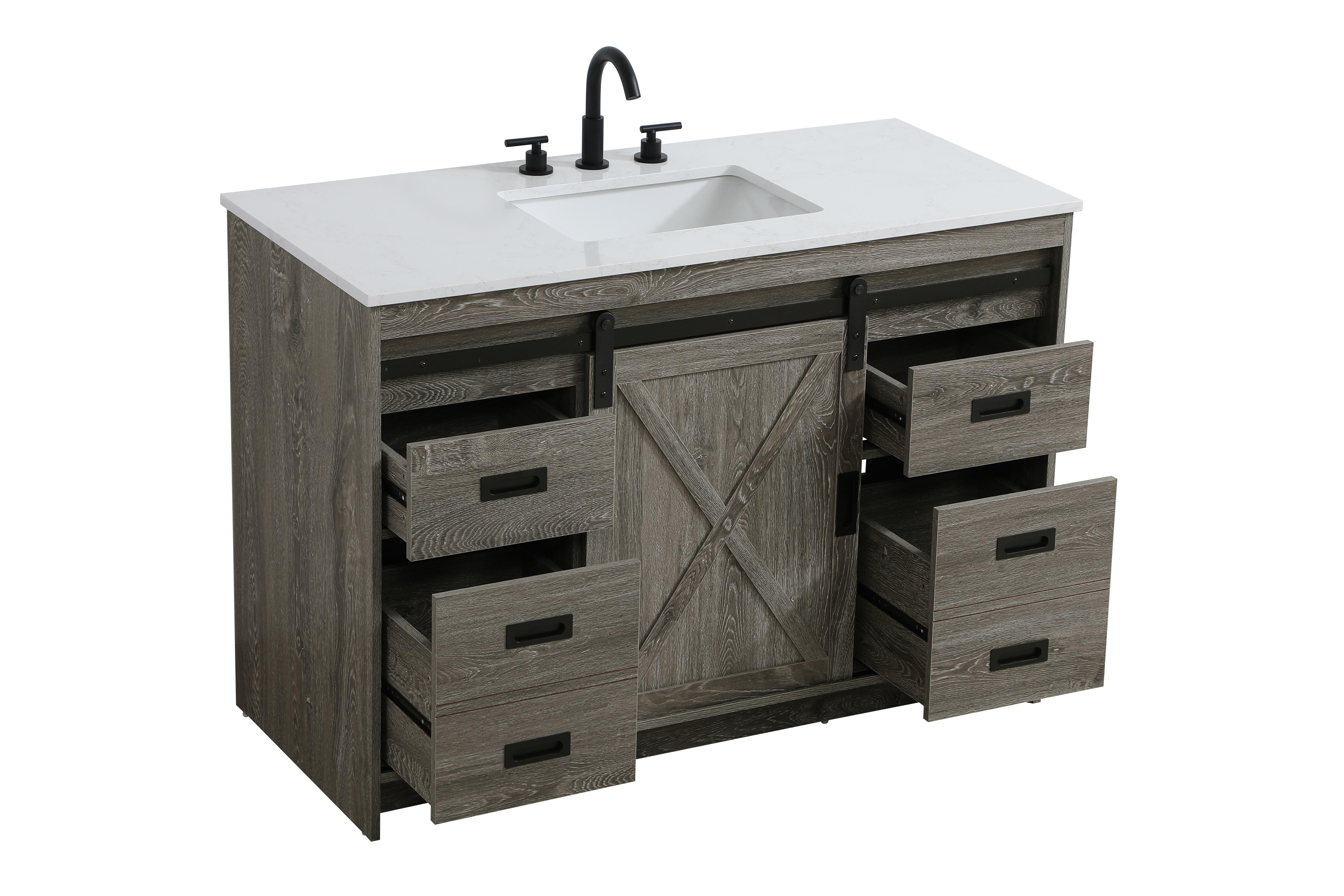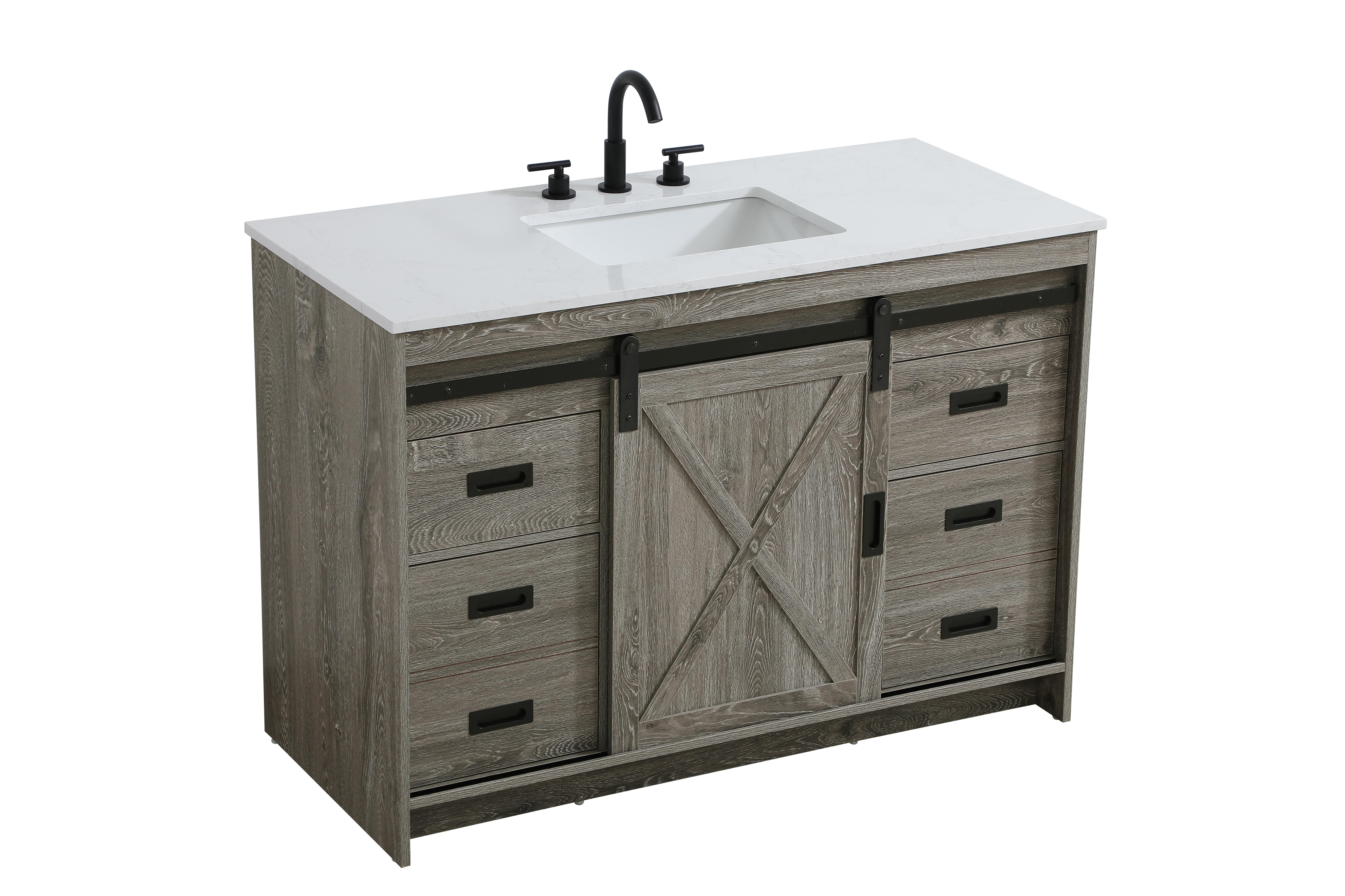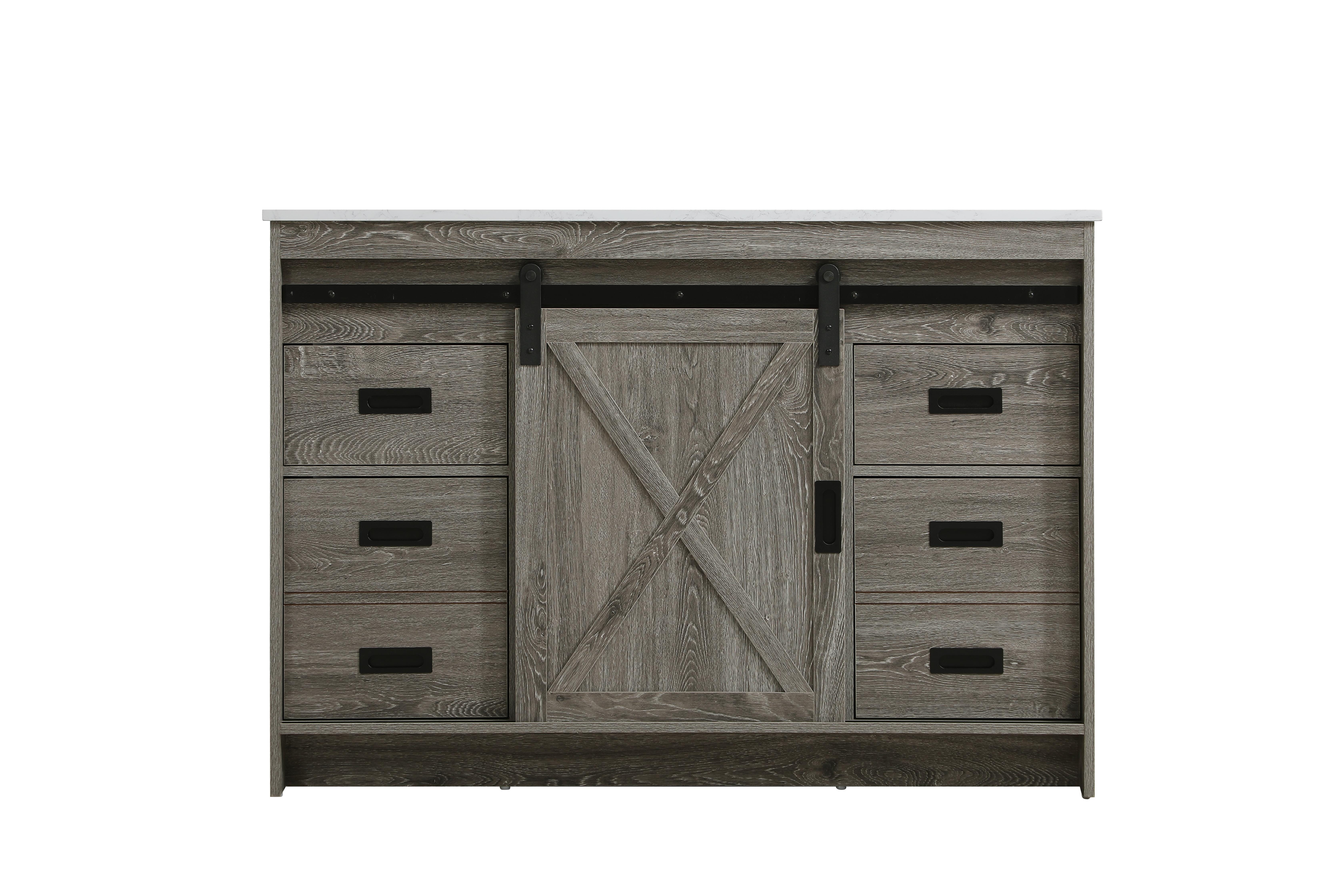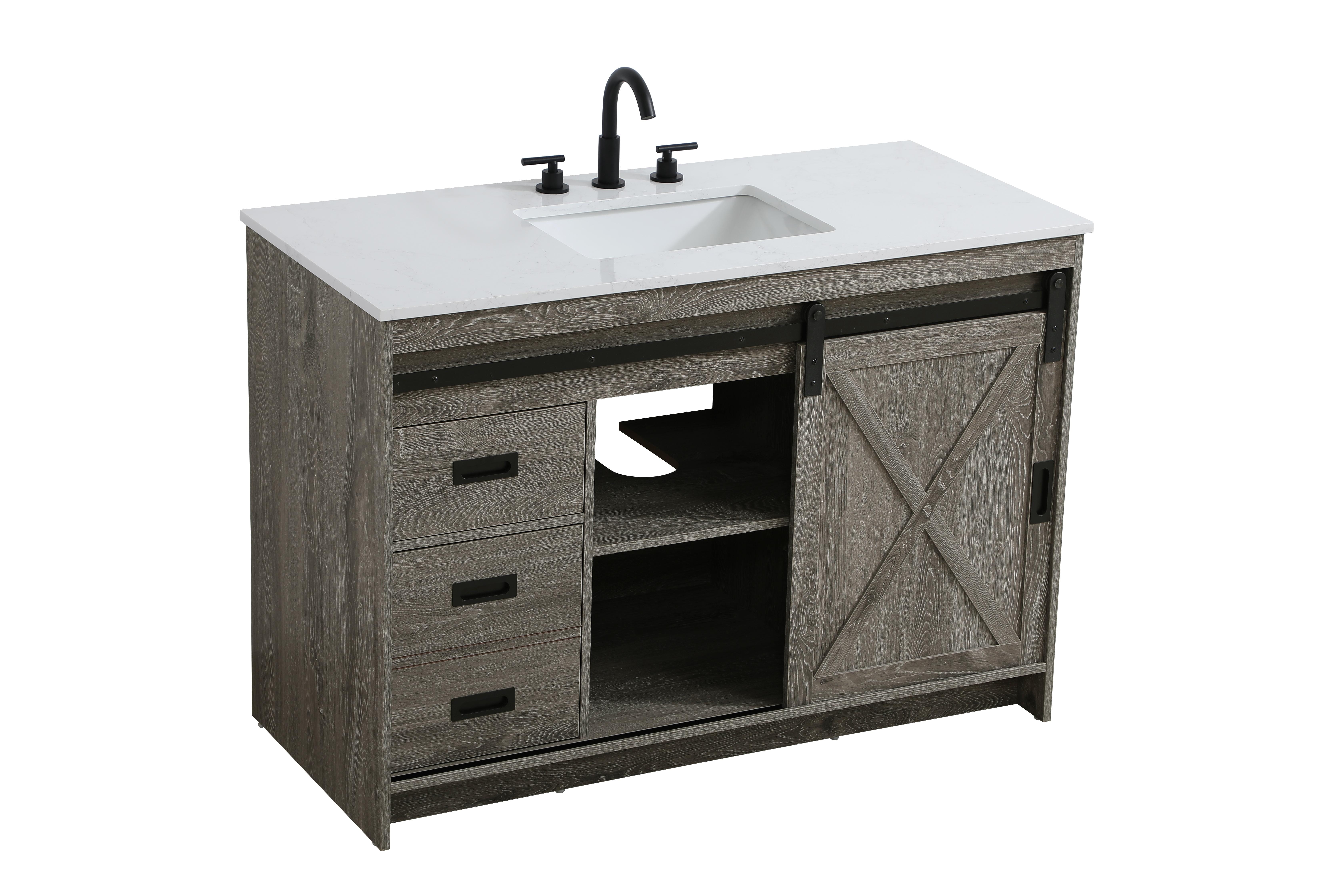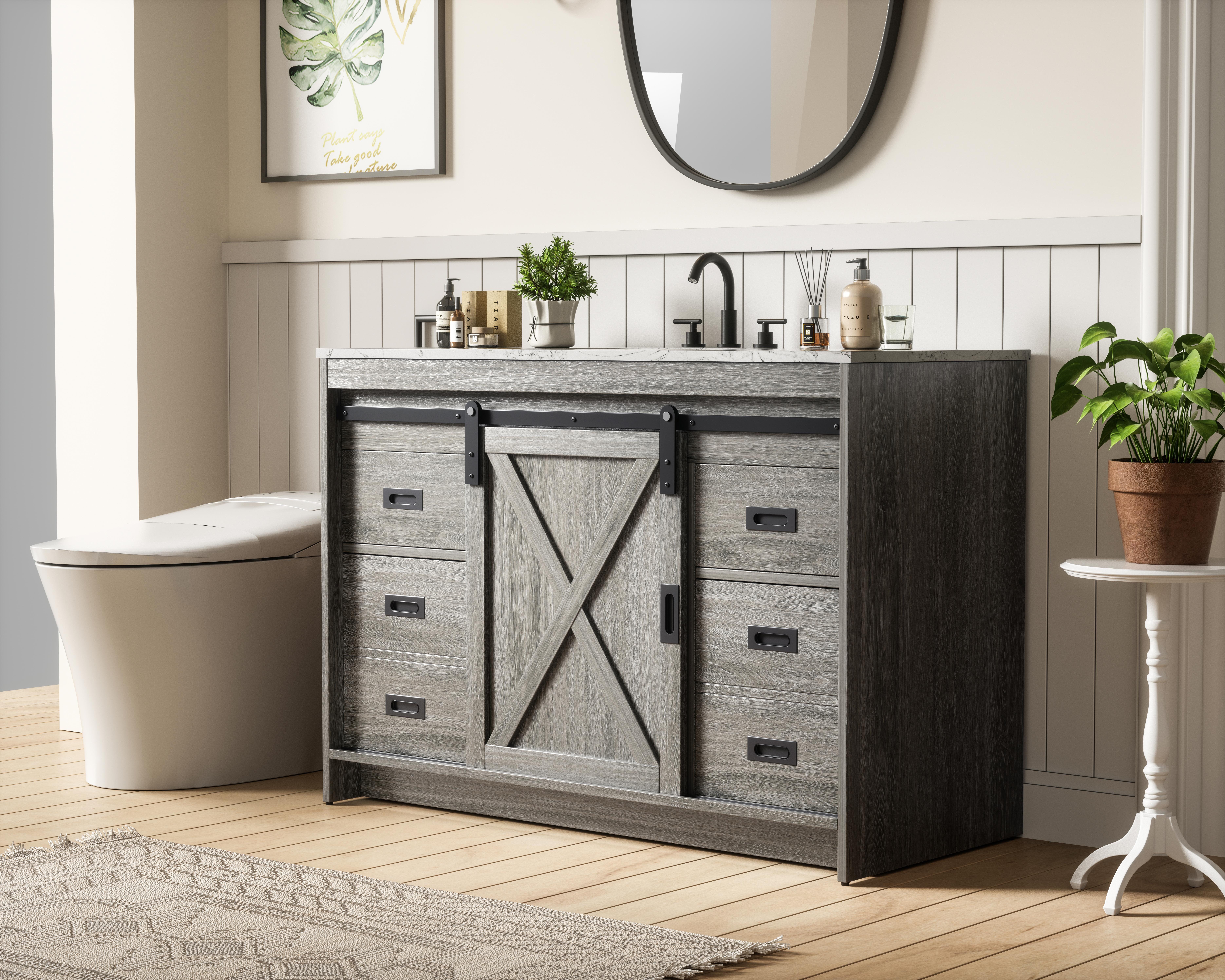 Transform your bathroom with this rustic barnyard-style vanity, designed to balance aesthetic appeal and functionality. Featuring a sliding barn door with black metal hardware and complementary handle pulls, this piece blends rugged charm with practical design. The engineered marble countertop displays unique marbling, while the porcelain undermount sink offers easy maintenance and durability. Available in Espresso, Natural Oak, and Rustic Grey finishes, this vanity suits a range of styles. It includes a deep storage drawer for larger items, a hidden shelf for towels or decor, and adjustable foot levelers for added stability on uneven floors. With pre-drilled faucet holes for easy setup, this vanity delivers style and substance to enhance your bathroom.