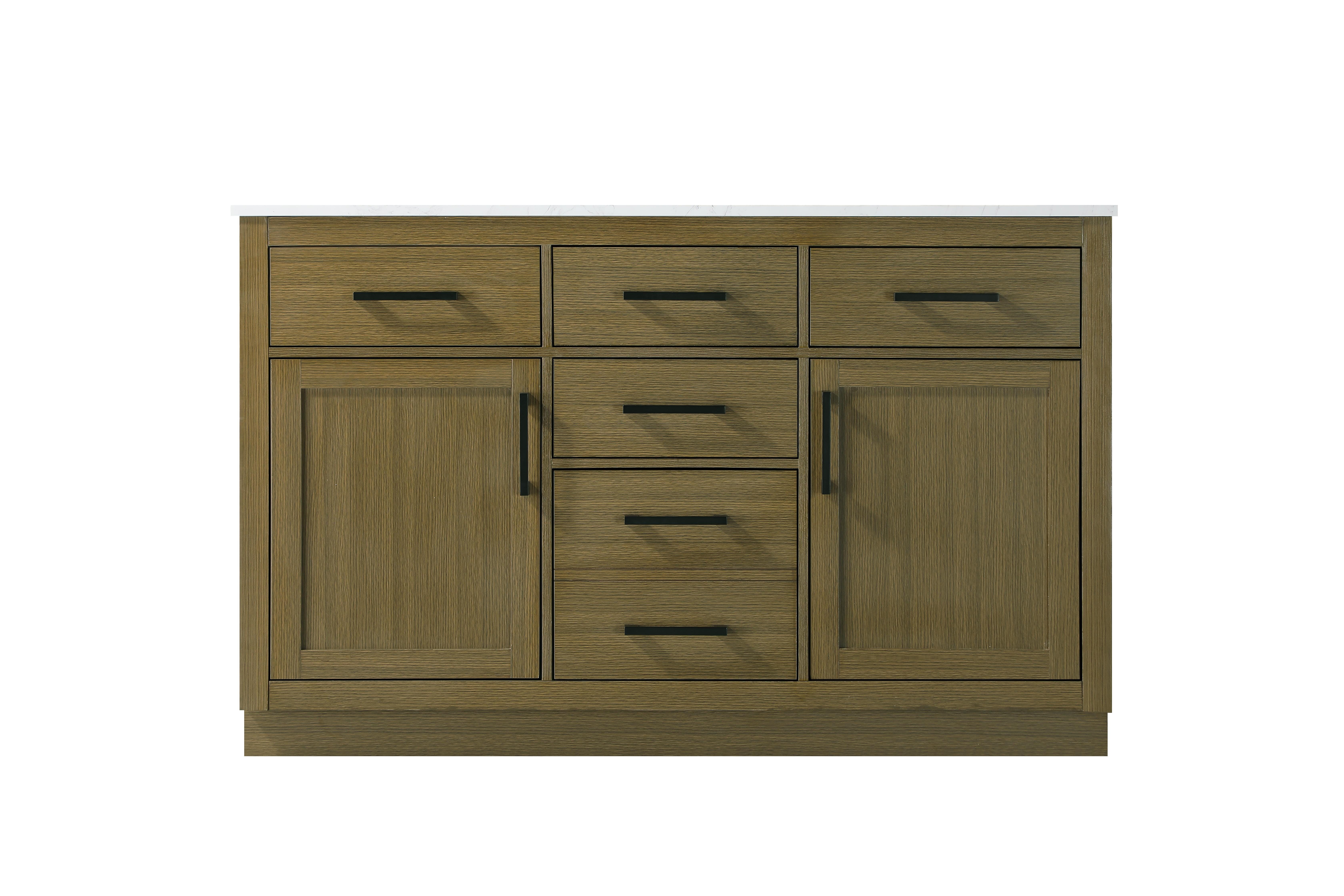 Introduce a perfect balance of functionality and style to your bathroom with this thoughtfully designed vanity. Constructed with a combination of solid wood and MDF, it offers durability and a sturdy build. The sleek engineered marble countertop with subtle grey marbling complements the rustic wood grain finish, creating a stylish and inviting centerpiece for your bathroom. Designed in a contemporary style with a transitional flair, it features a U-shaped shelf for seamless plumbing integration and multiple soft-close drawers for clutter-free organization. A pull-down drawer enhances convenience, while the toe kick adds a refined, clean-lined appearance and simplifies cleaning underneath. Matte black hardware contrasts beautifully with the cabinet finish, tying the look together. Delivered fully assembled and equipped with foot levelers, this vanity combines practicality and aesthetic appeal to suit modern and transitional bathrooms alike.