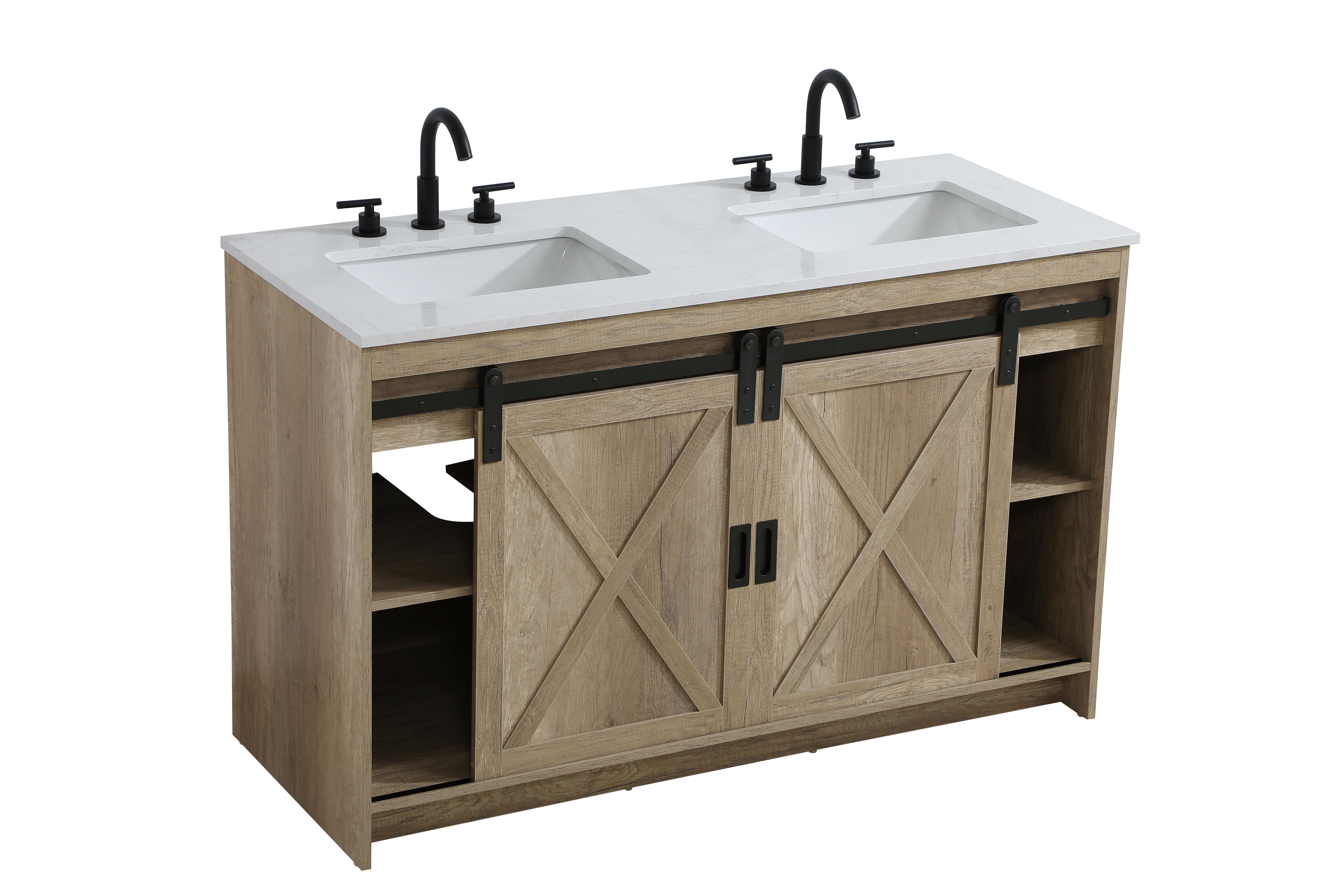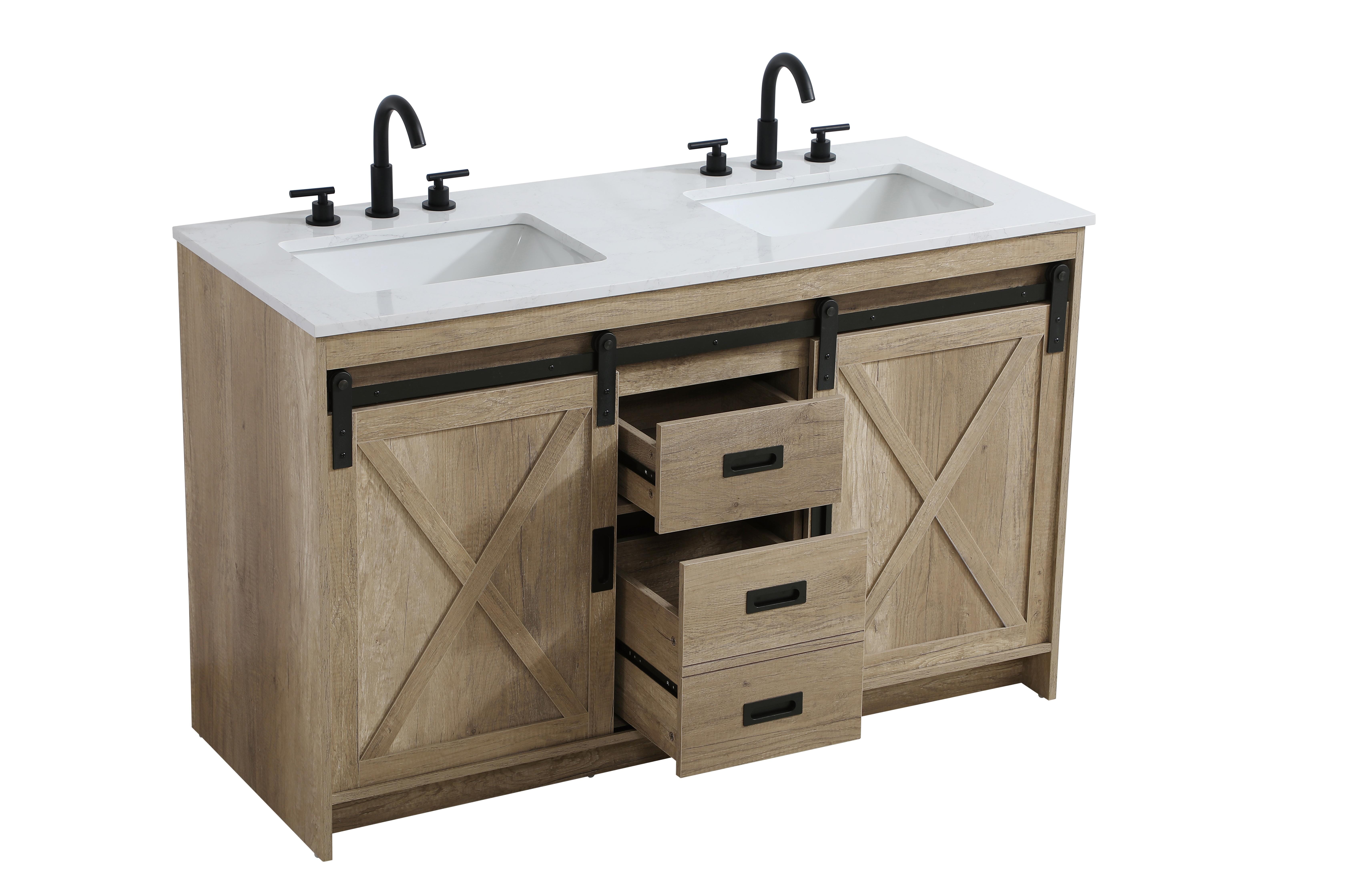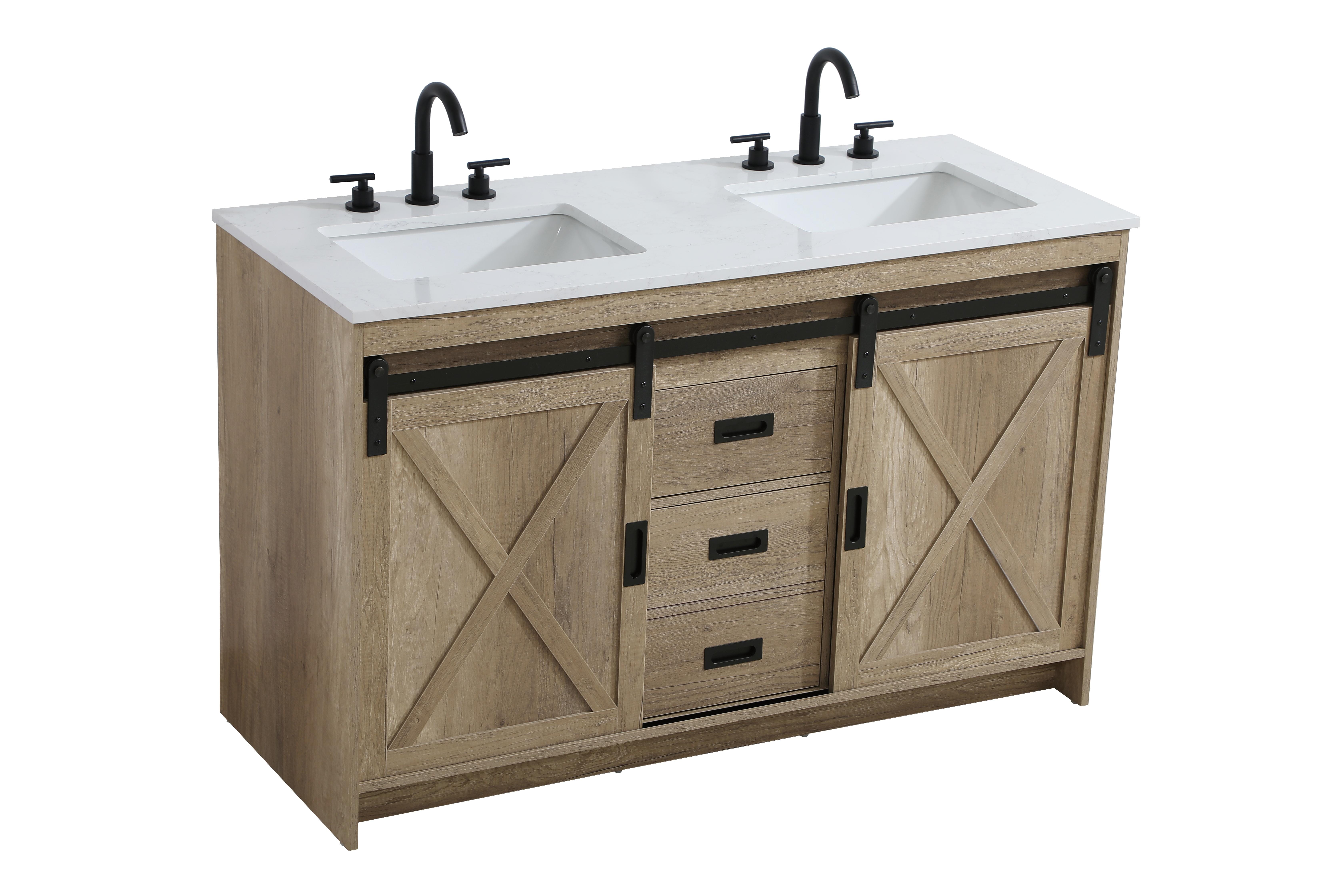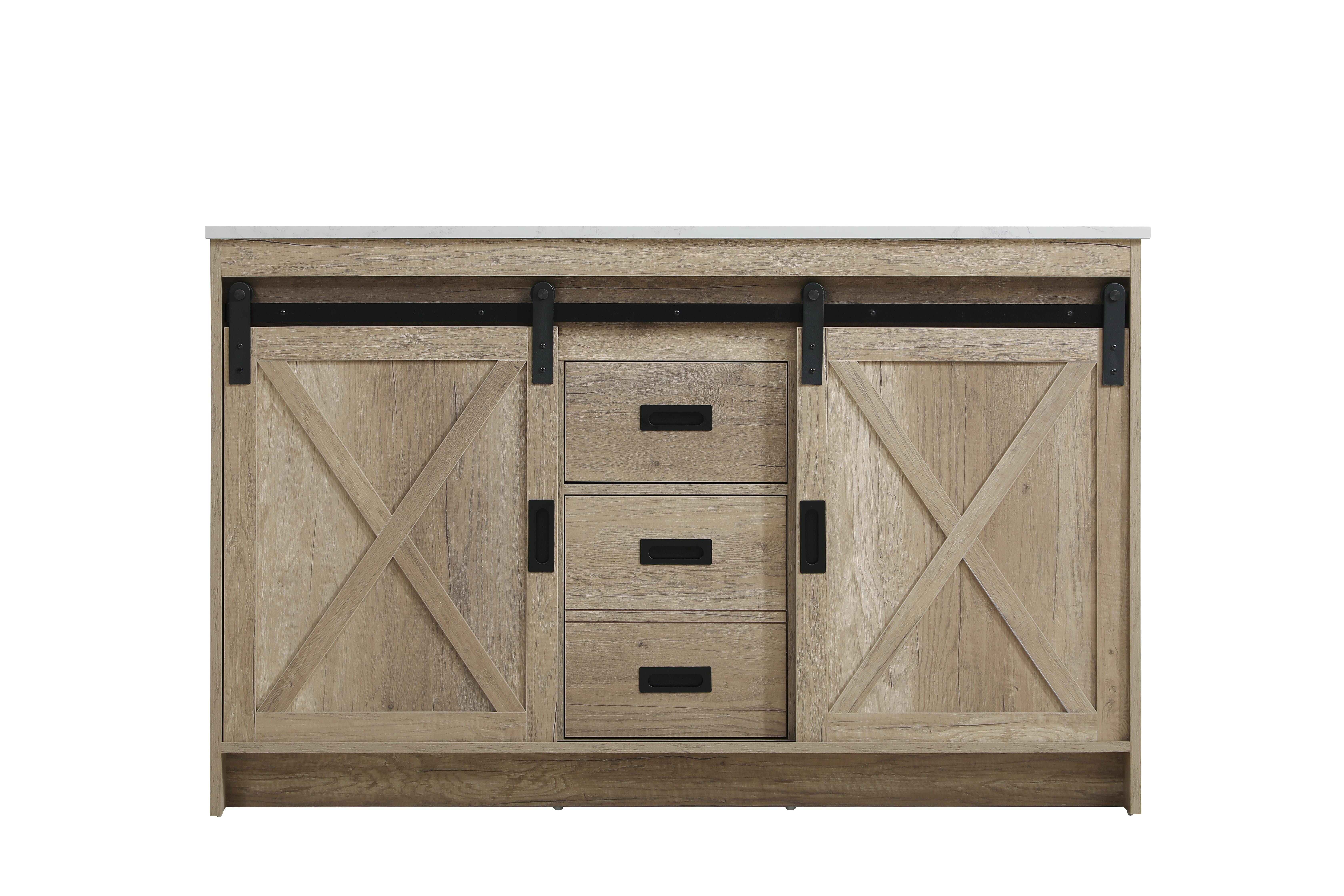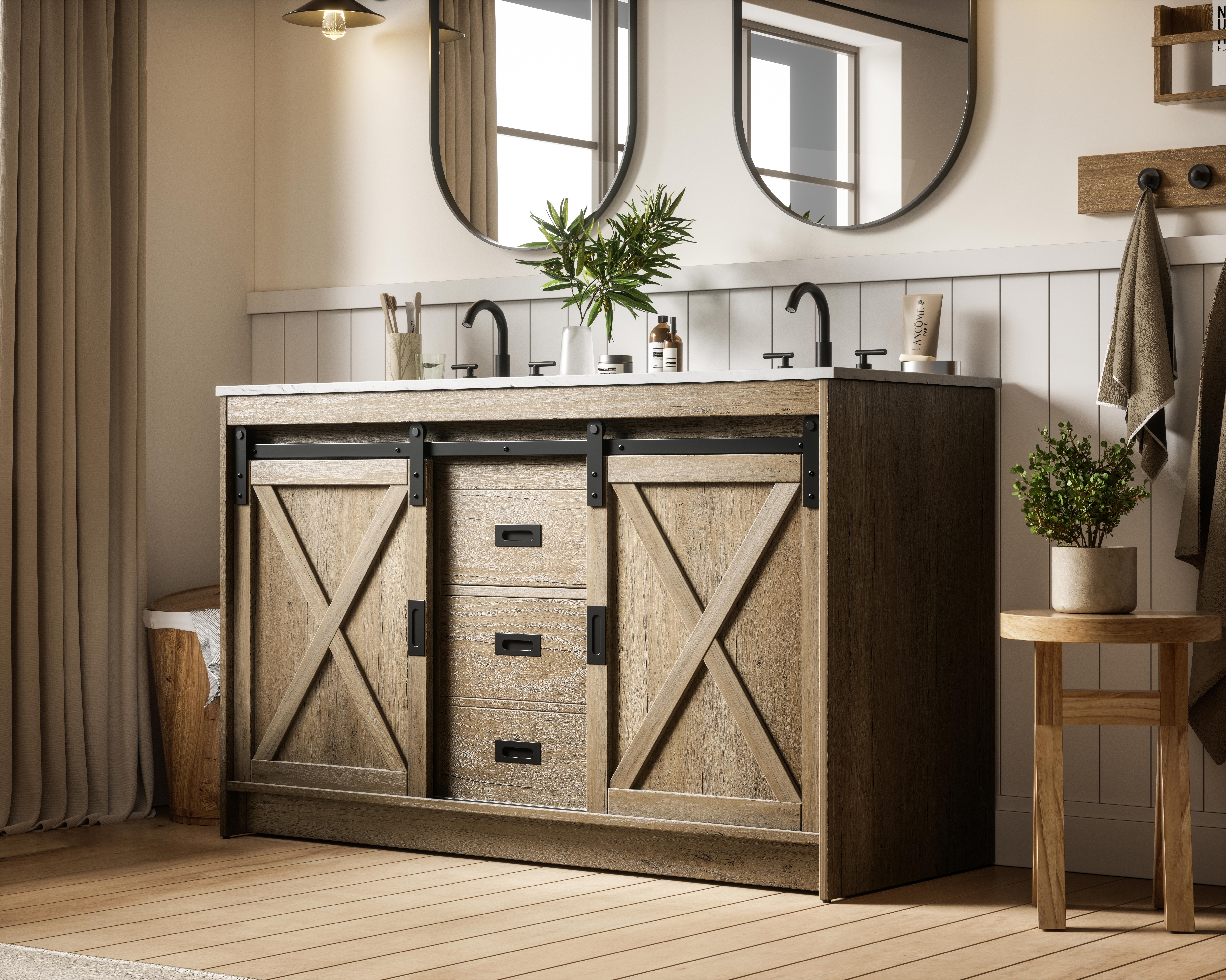 Transform your bathroom with this rustic barnyard-style vanity, designed to balance aesthetic appeal and functionality. Featuring a sliding barn door with black metal hardware and complementary handle pulls, this piece blends rugged charm with practical design. The engineered marble countertop displays unique marbling, while the porcelain undermount sink offers easy maintenance and durability. Available in Espresso, Natural Oak, and Rustic Grey finishes, this vanity suits a range of styles. It includes a deep storage drawer for larger items, a hidden shelf for towels or decor, and adjustable foot levelers for added stability on uneven floors. With pre-drilled faucet holes for easy setup, this vanity delivers style and substance to enhance your bathroom.