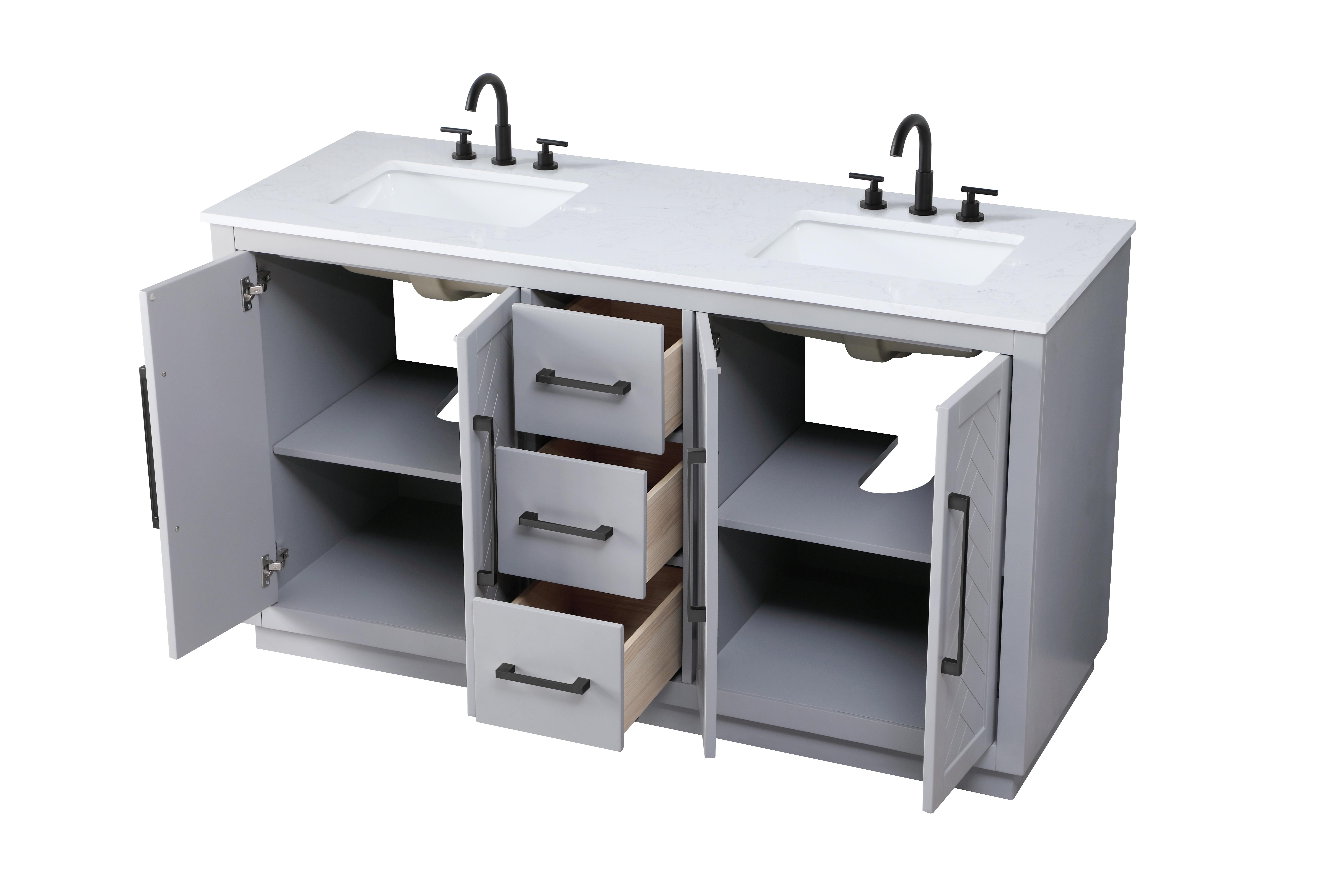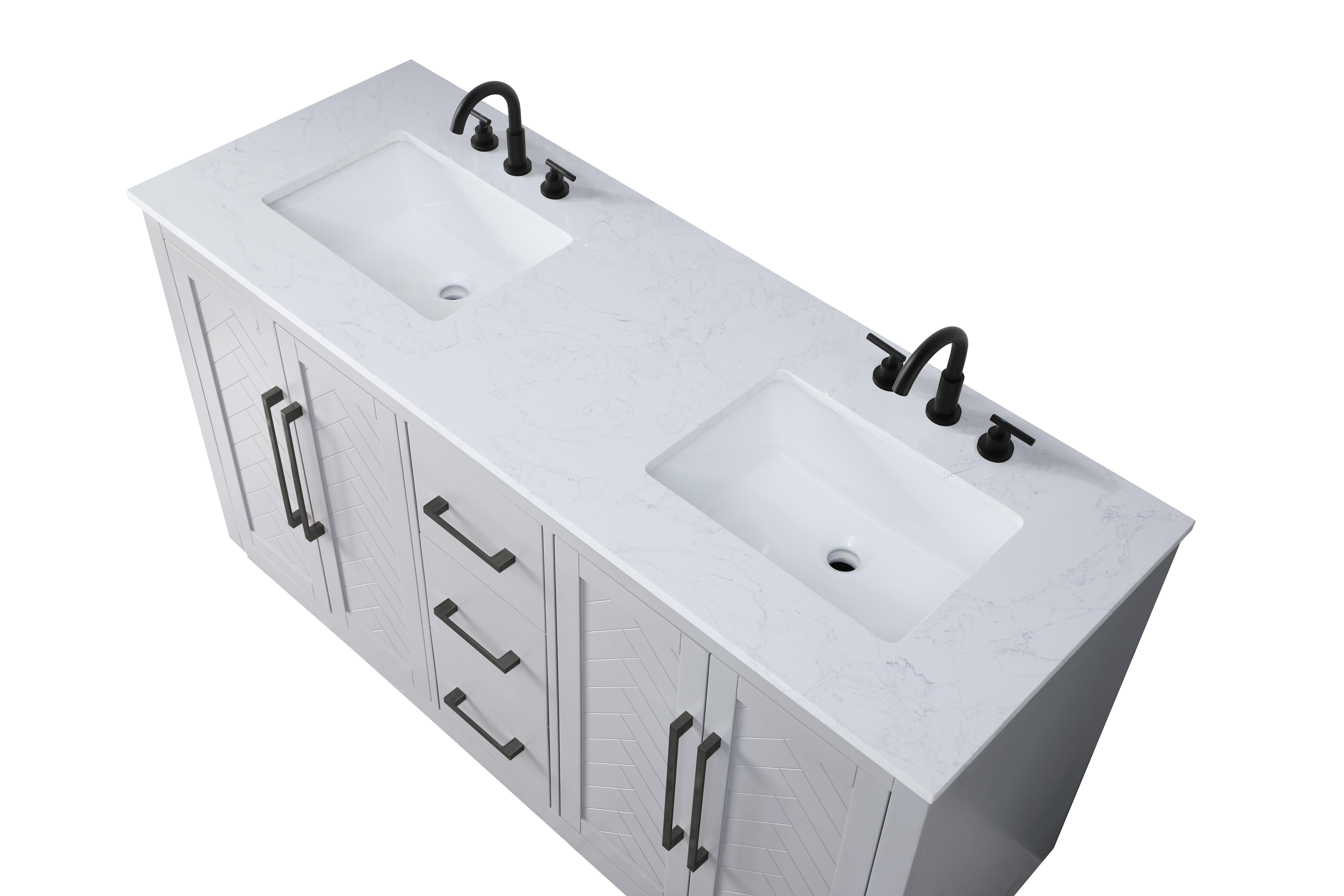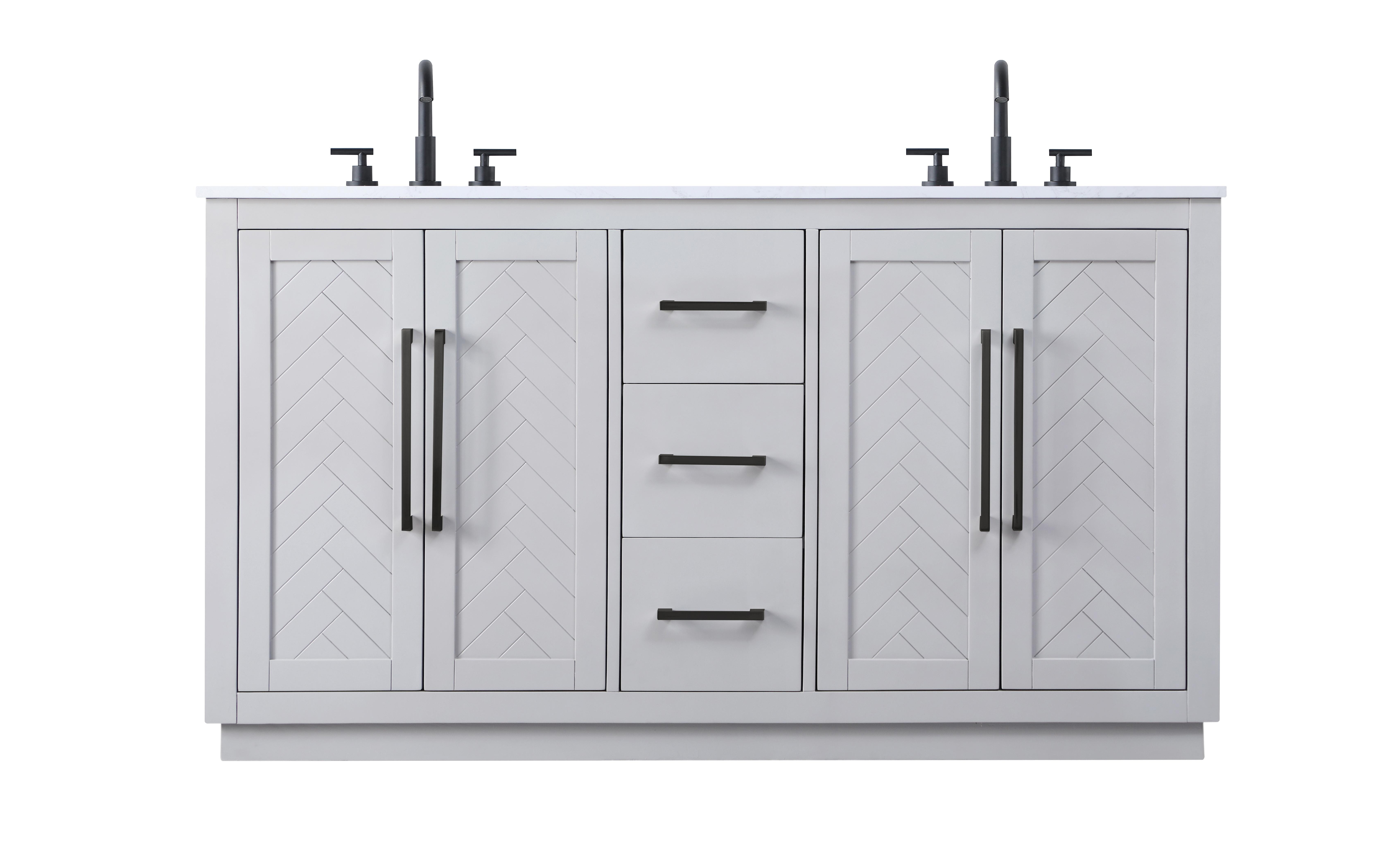 This Modern Fitting transitional bathroom vanity offers the perfect blend of timeless style and modern functionality. Available in five refined finishes-crisp white, sleek grey, chocolate oak, honey oak, and linen oak-it complements a range of decor styles, from classic to contemporary. The stunning herringbone design on the Shaker-style door panels adds texture and craftsmanship to the piece. Topped with a white marble countertop featuring subtle veining, it provides both beauty and durability. The long black metal pulls on the soft-closing doors add sleek, modern detailing. Practical features include a concealed overflow, a back panel cutout for easy plumbing installation, and a U-shaped cutout shelf to fit plumbing while maximizing storage space. With a toe kick all around the base, this vanity is thoughtfully designed to blend form and function in any bathroom setting.