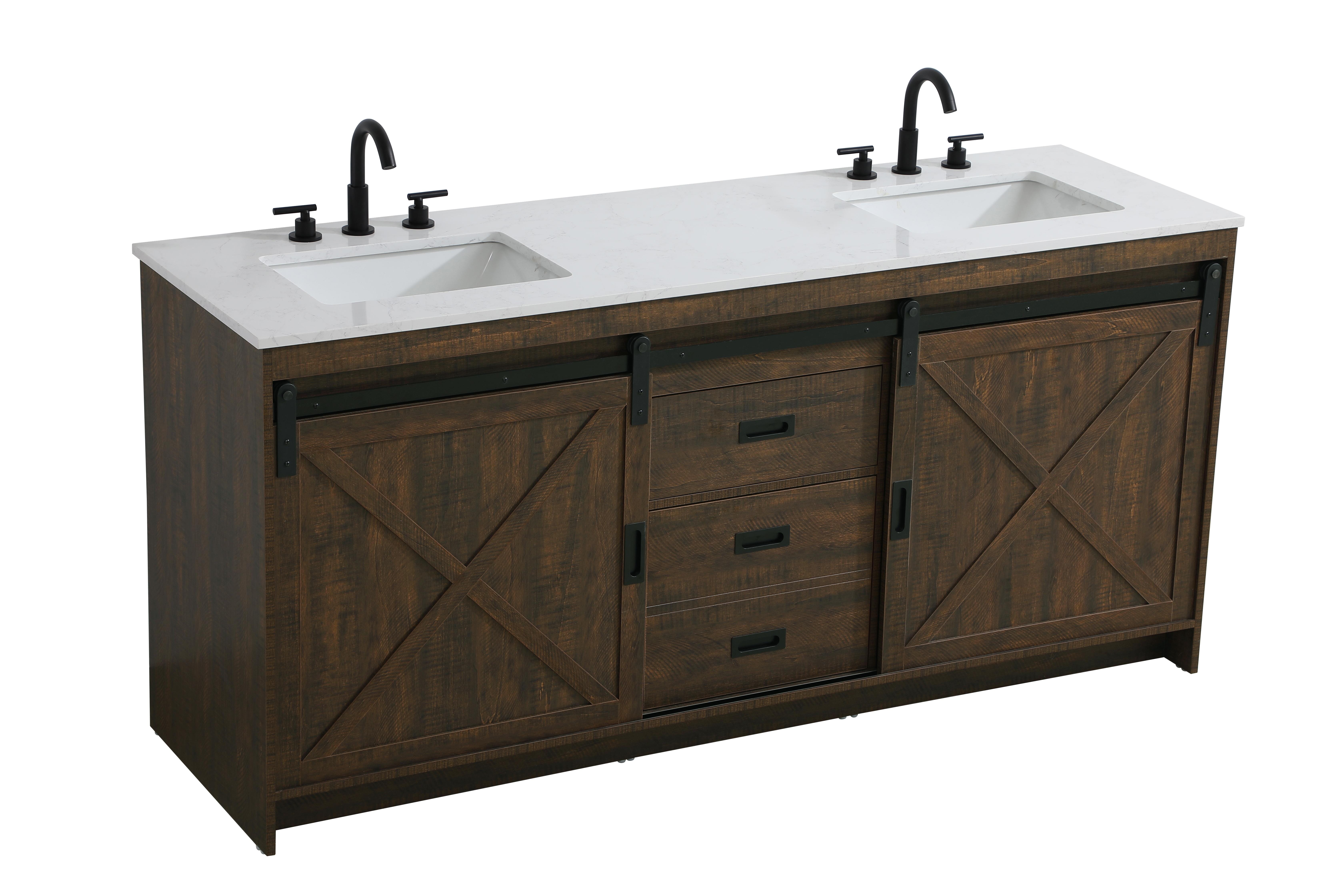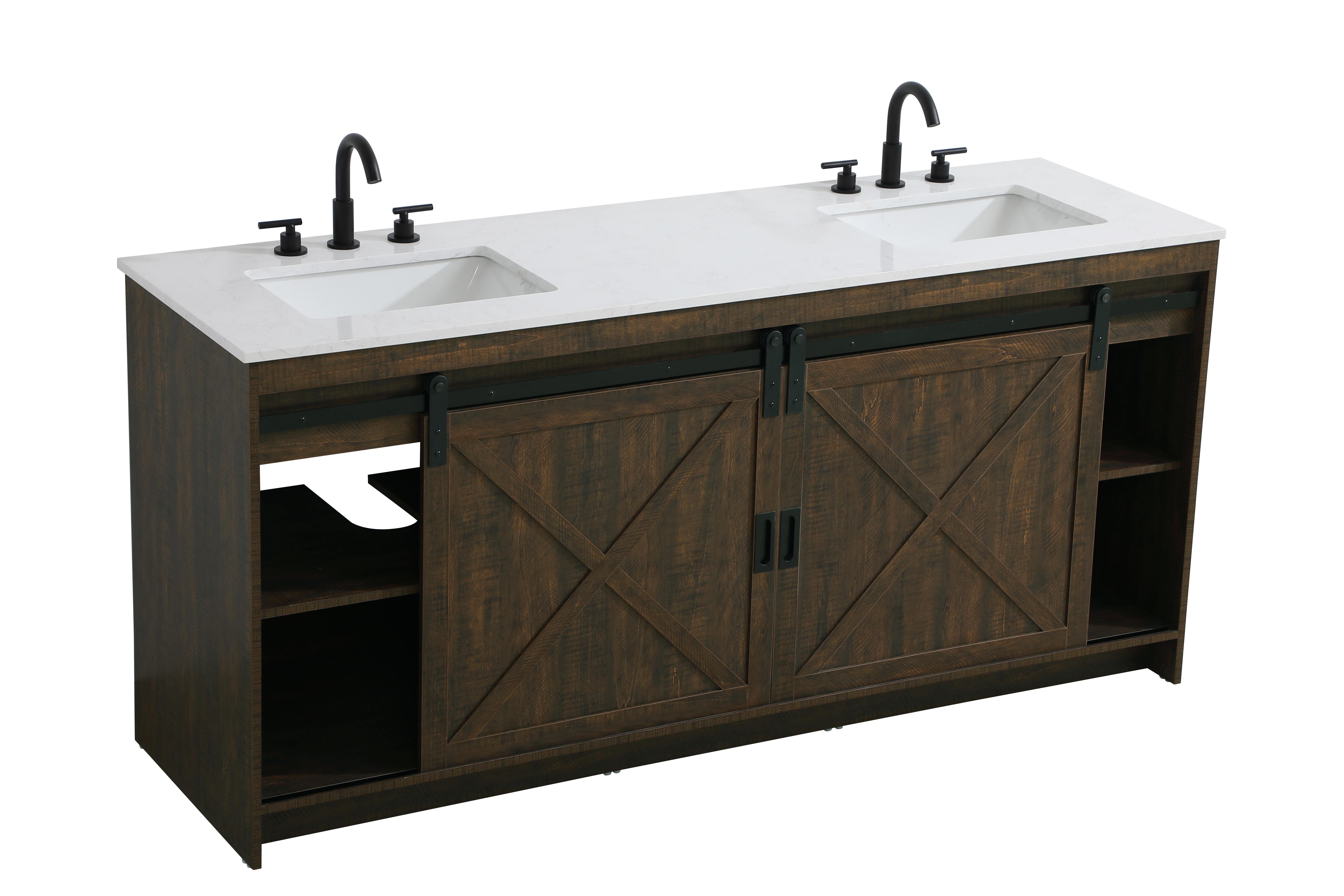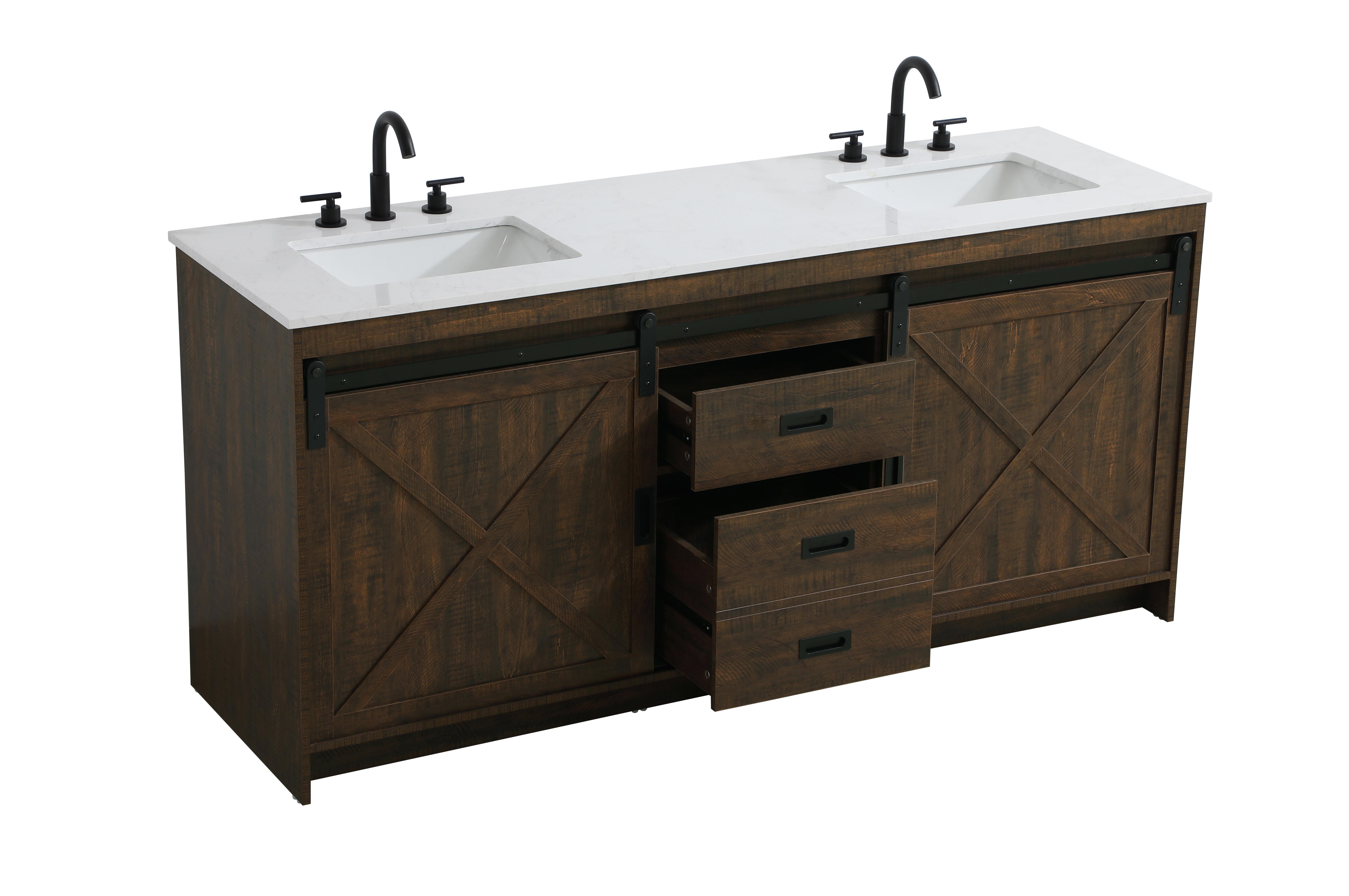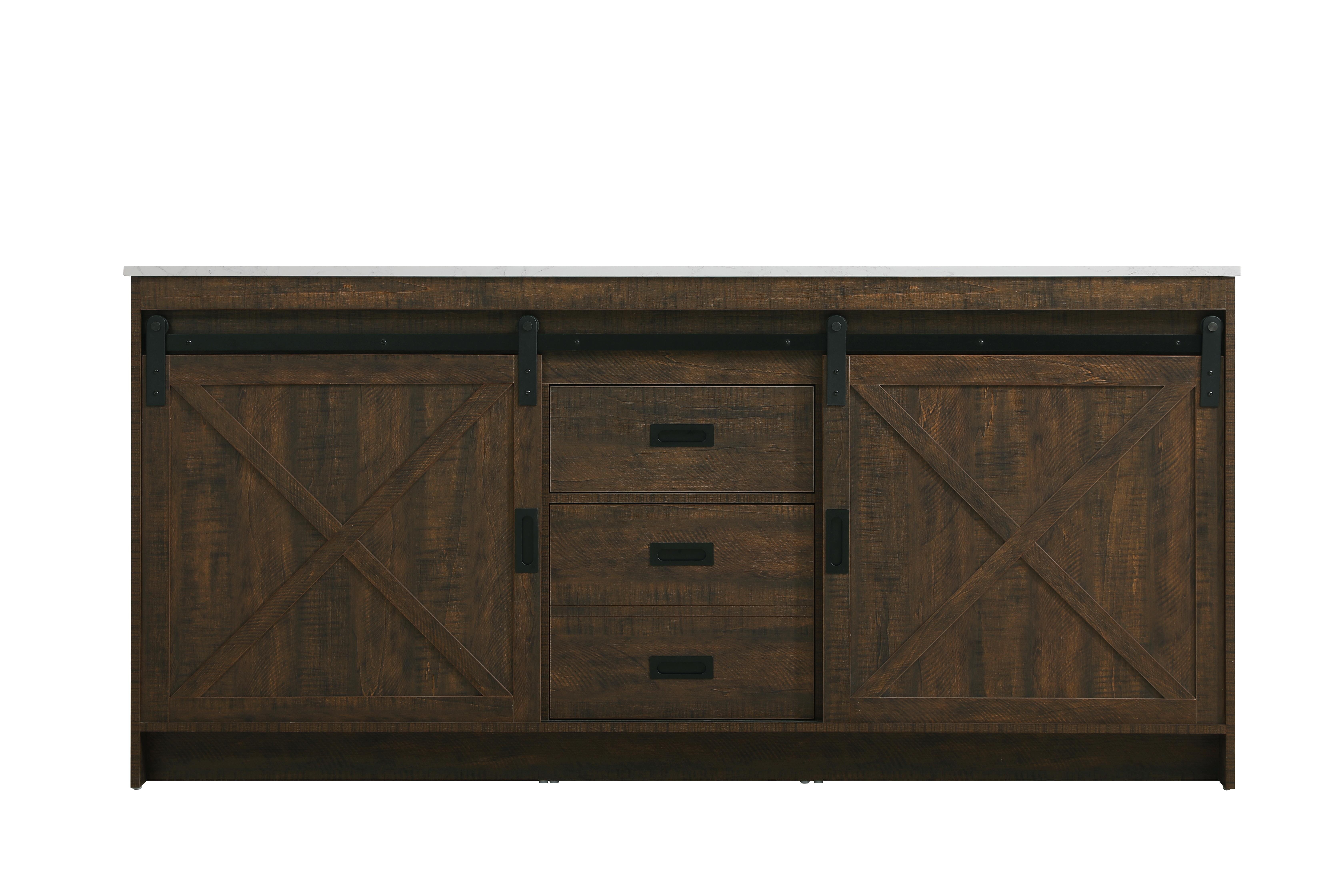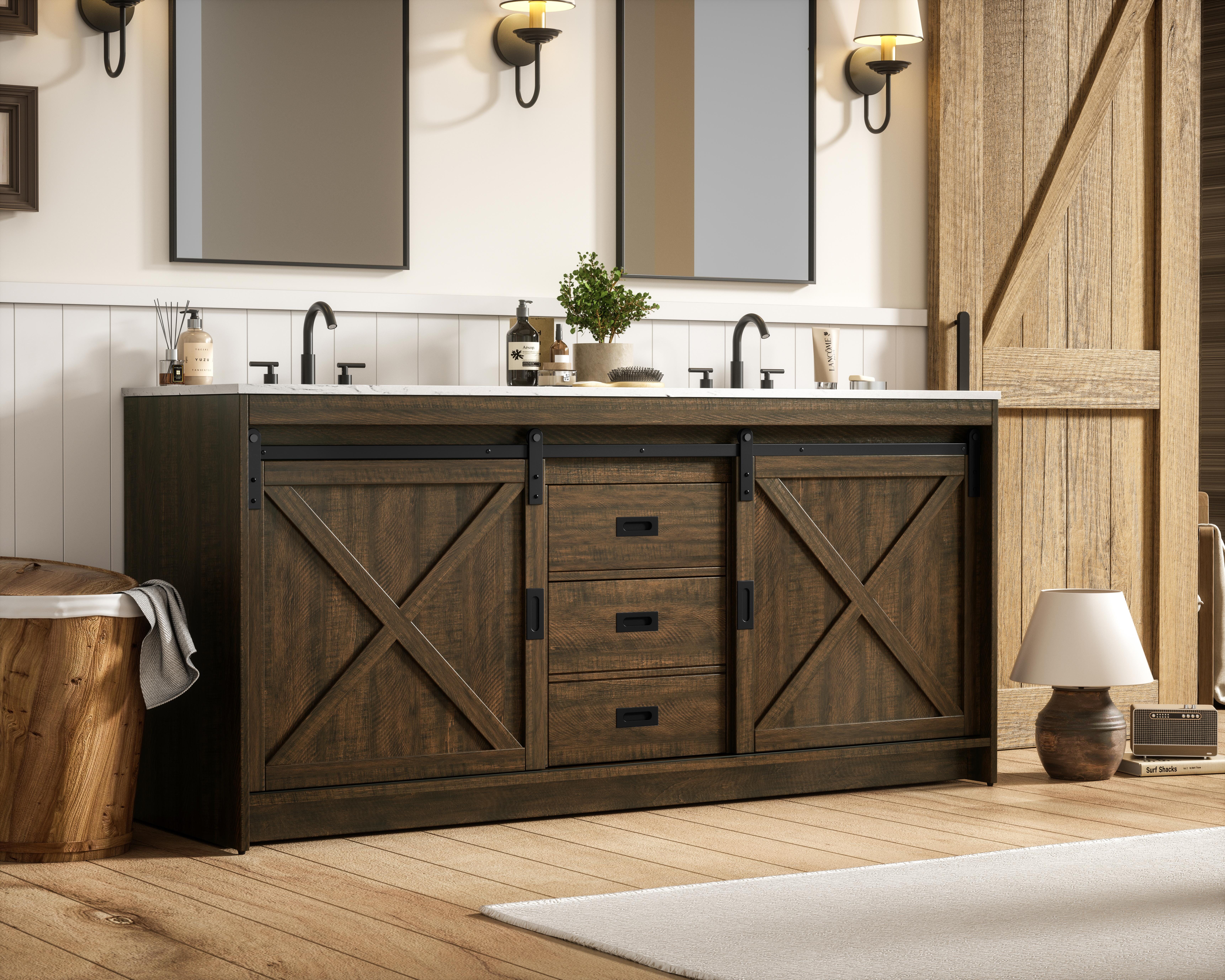 Transform your bathroom with this rustic barnyard-style vanity, designed to balance aesthetic appeal and functionality. Featuring a sliding barn door with black metal hardware and complementary handle pulls, this piece blends rugged charm with practical design. The engineered marble countertop displays unique marbling, while the porcelain undermount sink offers easy maintenance and durability. Available in Espresso, Natural Oak, and Rustic Grey finishes, this vanity suits a range of styles. It includes a deep storage drawer for larger items, a hidden shelf for towels or decor, and adjustable foot levelers for added stability on uneven floors. With pre-drilled faucet holes for easy setup, this vanity delivers style and substance to enhance your bathroom.