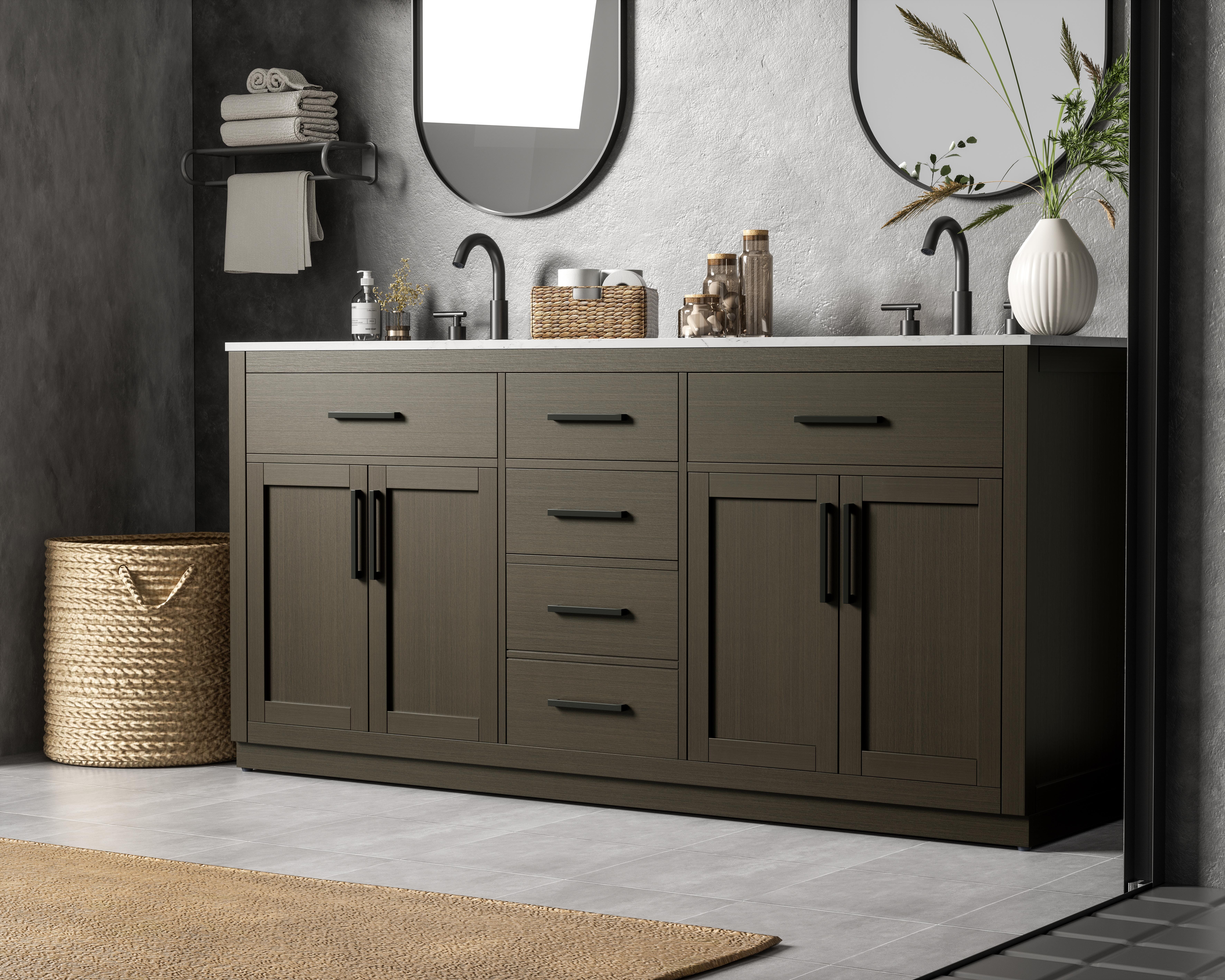 Introduce a perfect balance of functionality and style to your bathroom with this thoughtfully designed vanity. Constructed with a combination of solid wood and MDF, it offers durability and a sturdy build. The sleek engineered marble countertop with subtle grey marbling complements the rustic wood grain finish, creating a stylish and inviting centerpiece for your bathroom. Designed in a contemporary style with a transitional flair, it features a U-shaped shelf for seamless plumbing integration and multiple soft-close drawers for clutter-free organization. A pull-down drawer enhances convenience, while the toe kick adds a refined, clean-lined appearance and simplifies cleaning underneath. Matte black hardware contrasts beautifully with the cabinet finish, tying the look together. Delivered fully assembled and equipped with foot levelers, this vanity combines practicality and aesthetic appeal to suit modern and transitional bathrooms alike.