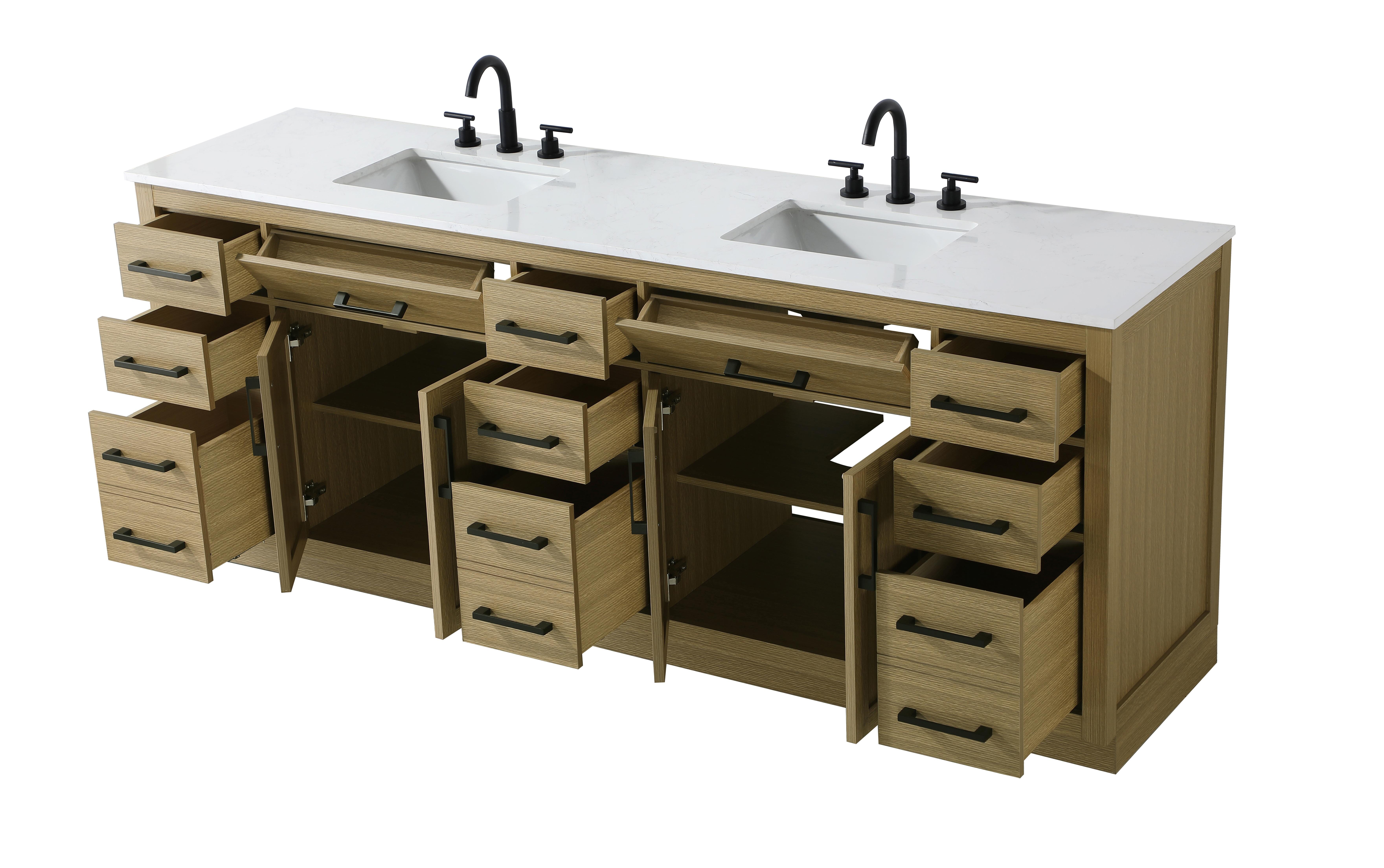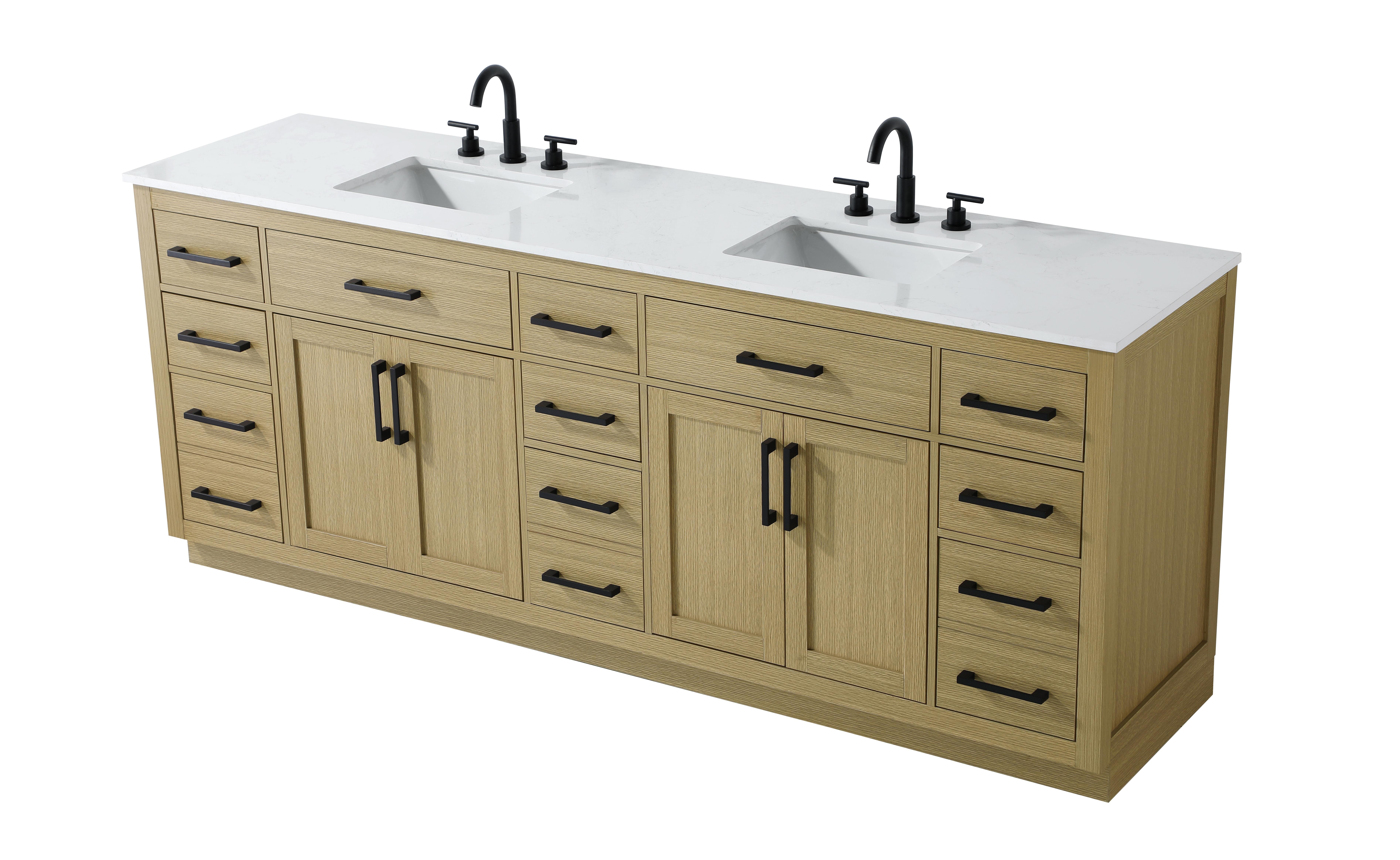 Introduce a perfect balance of functionality and style to your bathroom with this thoughtfully designed vanity. Constructed with a combination of solid wood and MDF, it offers durability and a sturdy build. The sleek engineered marble countertop with subtle grey marbling complements the rustic wood grain finish, creating a stylish and inviting centerpiece for your bathroom. Designed in a contemporary style with a transitional flair, it features a U-shaped shelf for seamless plumbing integration and multiple soft-close drawers for clutter-free organization. A pull-down drawer enhances convenience, while the toe kick adds a refined, clean-lined appearance and simplifies cleaning underneath. Matte black hardware contrasts beautifully with the cabinet finish, tying the look together. Delivered fully assembled and equipped with foot levelers, this vanity combines practicality and aesthetic appeal to suit modern and transitional bathrooms alike.