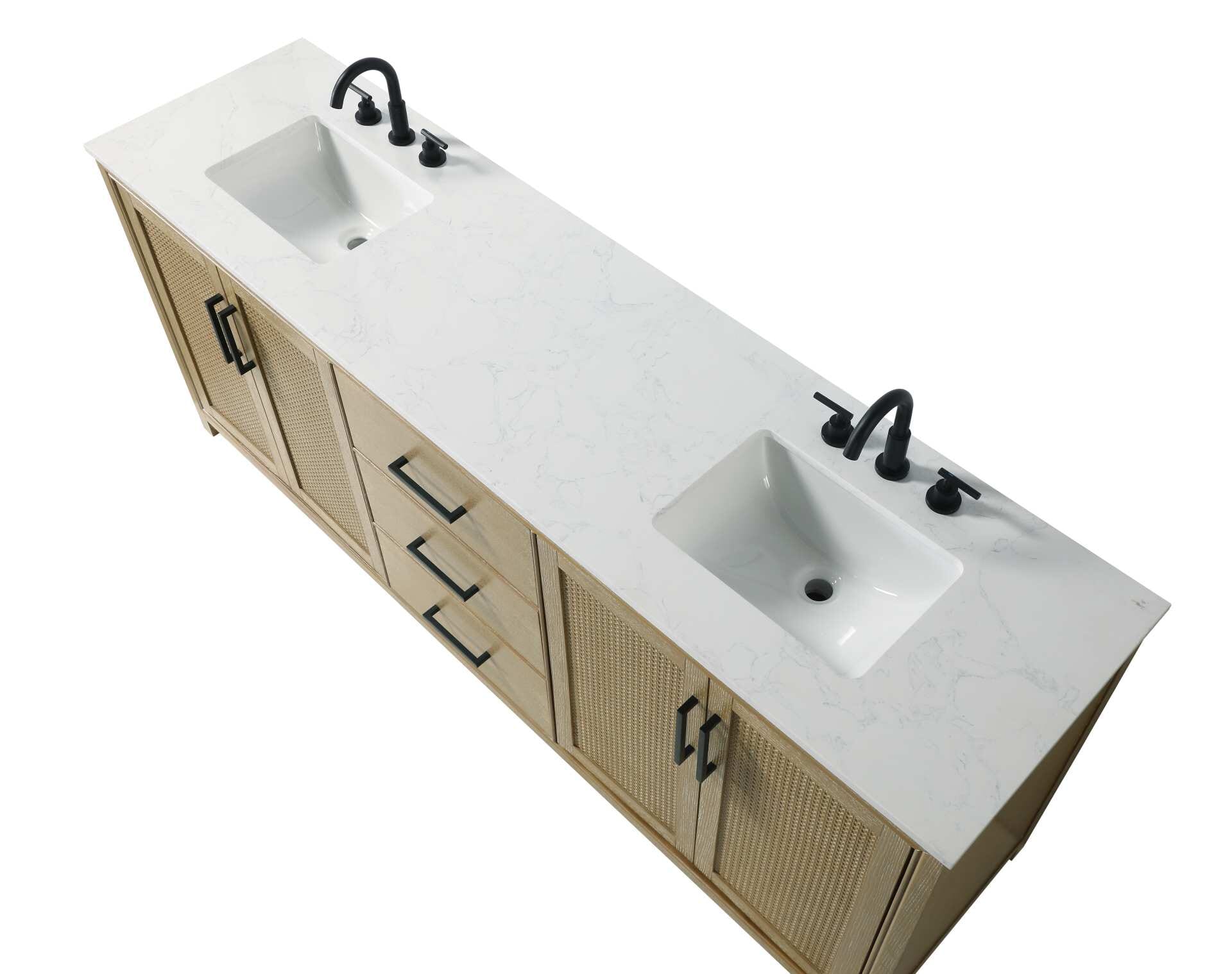 Perfect for those with an eye for detail and quality, this Modern Fitting transitional vanity blends modern design with timeless elegance. Available in five stunning finishes, from Crisp White to Linen Oak, the wood grain visuals of the oak options bring warmth and character to any bathroom. The caning design on the Shaker-style door panels adds texture and a touch of refinement, while the soft-closing doors ensure smooth, quiet functionality. Topped with a white marble countertop, the vanity offers both luxury and practicality, complete with pre-drilled faucet holes for customization. A concealed overflow and U-shaped shelf for plumbing make installation effortless, and the slender black metal pulls provide a sleek contrast.